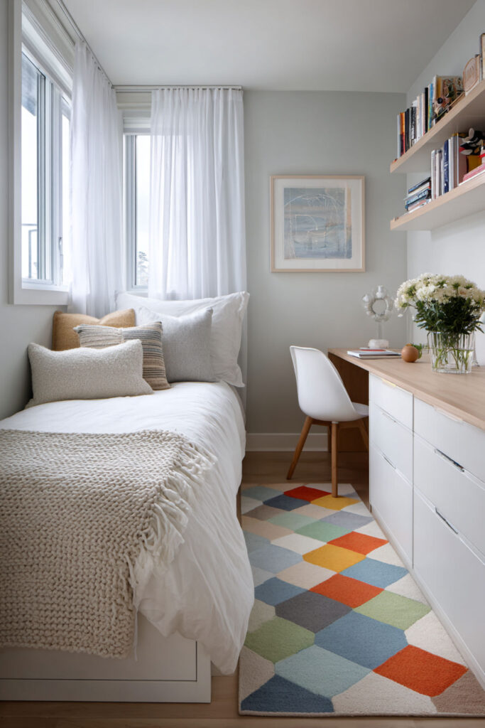 I strongly recommend this layered approach for rooms under 100 square feet. The key is thinking up, not out. Since implementing vertical solutions, your daughter’s tiny room feels spacious and organized. Some think small rooms can’t multitask – I think they force brilliant solutions.