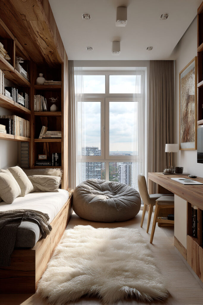 Long, narrow bedrooms present unique opportunities for separation. Place the bed at one end and create a complete study area at the other, with storage and a reading nook in between. This linear layout naturally divides activities. The distance between zones helps mental transitions. Rectangle shaped bedroom ideas often work better than square rooms for dual purposes.