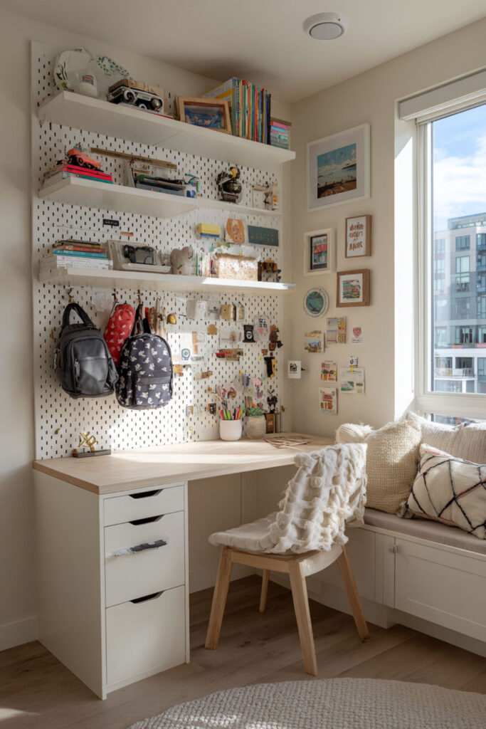 The most clever storage solutions serve multiple functions. I recommend an ottoman that opens for storage AND provides seating, installing a pegboard that holds supplies AND displays art, and choosing a desk with built-in organizers that grows with homework needs. Each piece earns its space twice over. The multipurpose approach prevents room overcrowding. This efficiency teaches smart resource use.