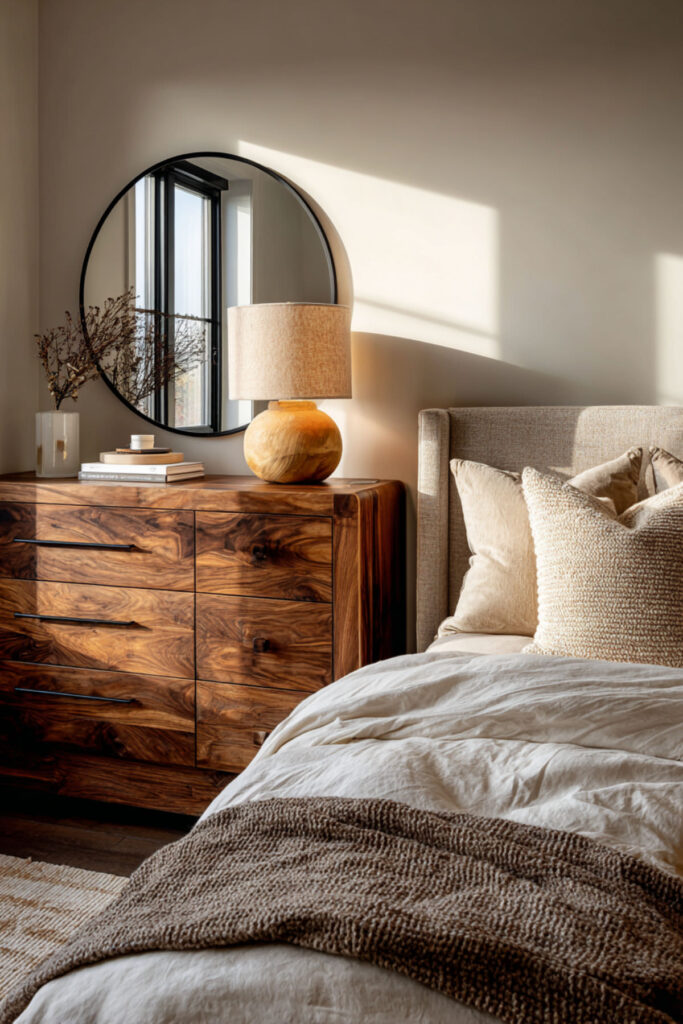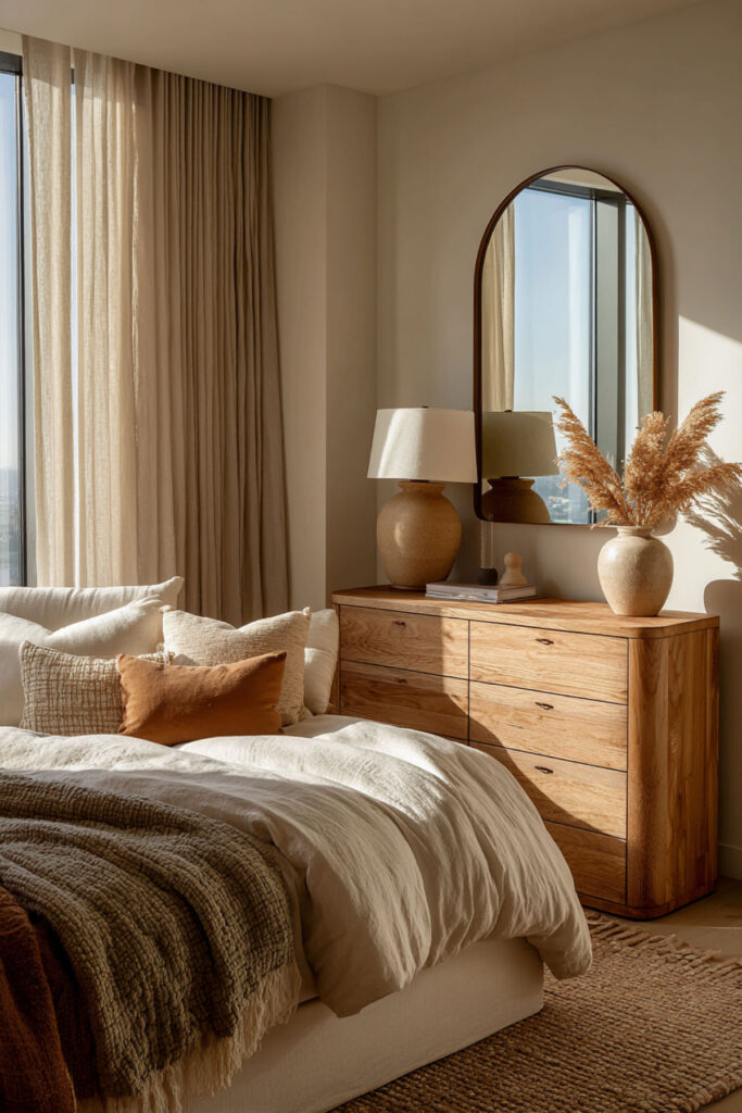 One of the strongest furniture trends heading into 2026 is the organic modern movement — pieces with rounded edges, curved drawer fronts, soft corners, and natural materials that feel warm and sculptural rather than sharp and geometric. Designers at Decorilla have specifically noted that dressers with gently rounded fronts are stepping into the spotlight as part of the wider organic-form movement. I strongly recommend an organic modern dresser in light or warm-toned wood with softly curved drawer faces and minimal visible hardware — push-to-open drawers or recessed pulls keep the lines clean. The rounded forms feel softer in the bedroom than traditional rectangular dressers, which matters when the goal is calm. This organic modern bedroom dressers idea is the most current option on this list, and it’s aging beautifully because the aesthetic is based on natural forms, not trends.