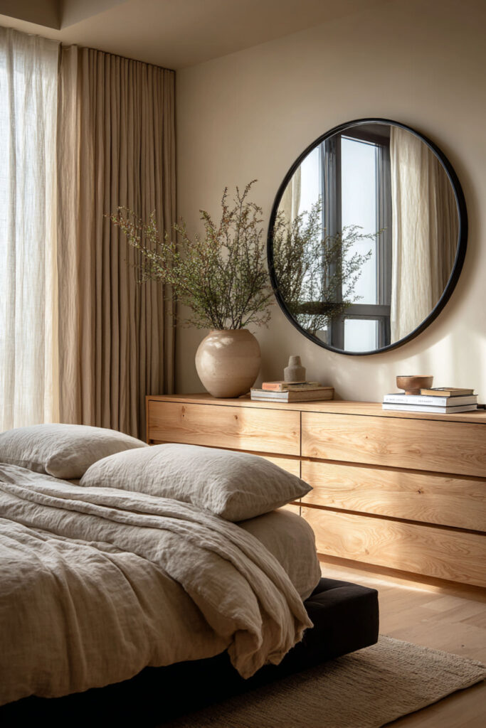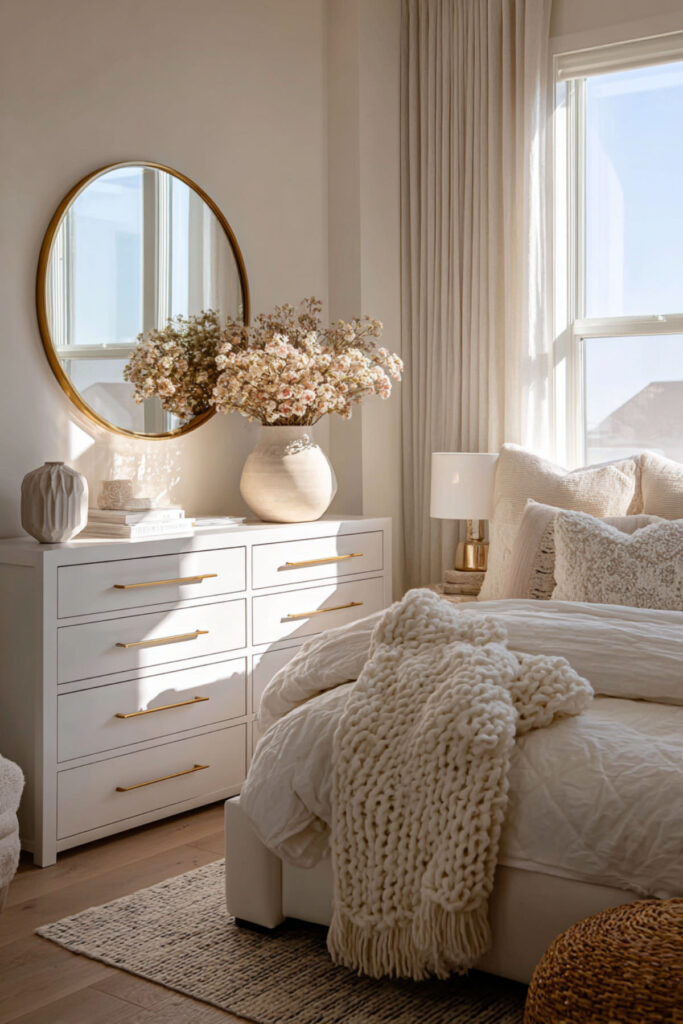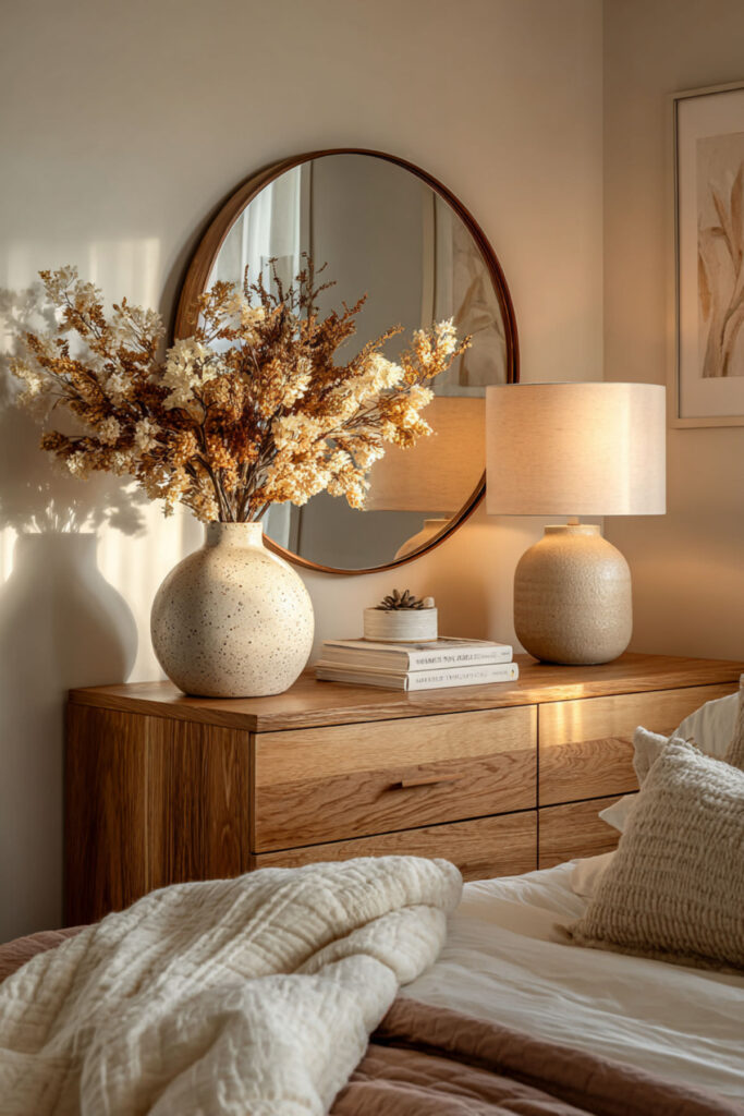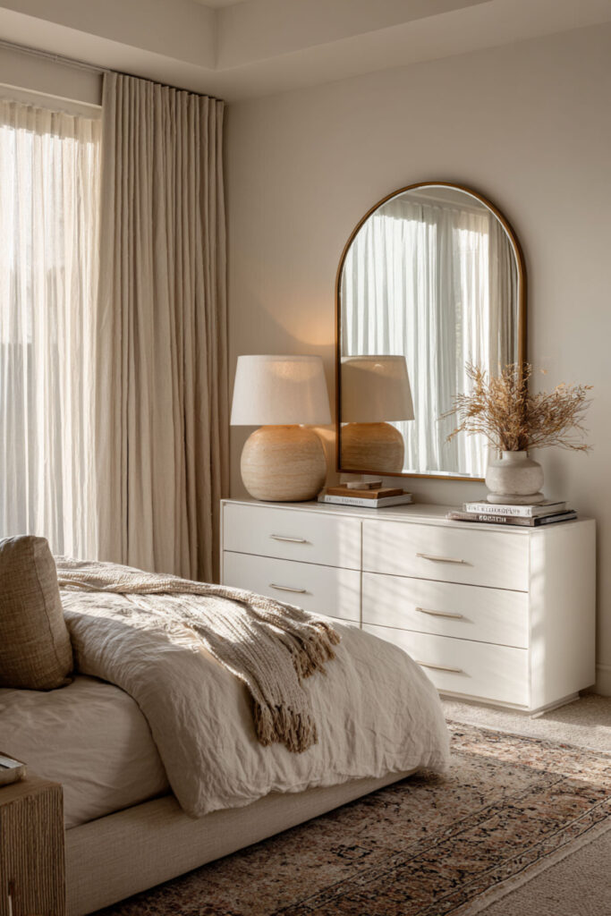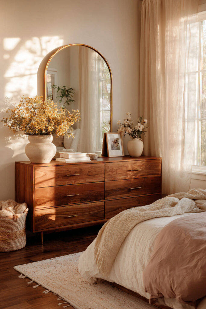 The top of a dresser is one of the most visible surfaces in the bedroom, and it’s also one of the most abused — a landing pad for receipts, loose change, water glasses, and whatever you pulled out of your pockets. Styling the dresser top intentionally prevents it from becoming a clutter magnet and turns it into a design feature. I recommend the three-object rule: a mirror (round, arched, or rectangular, leaning against the wall or hung above), a lamp or small stack of books for height variation, and one personal object — a small ceramic tray, a framed photo, or a single vase with greenery. Keep the rest of the surface empty. That negative space is what makes the arrangement look intentional. This how to style a dresser idea is the difference between a bedroom that looks “decorated” and a bedroom that looks lived-in with purpose.