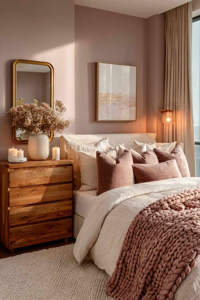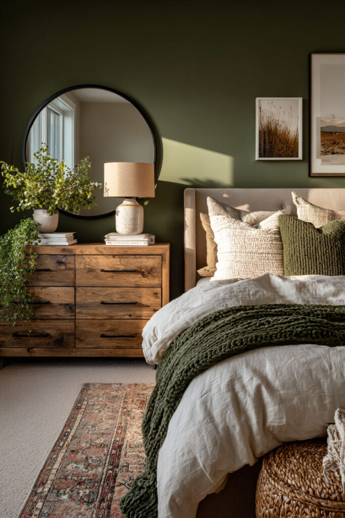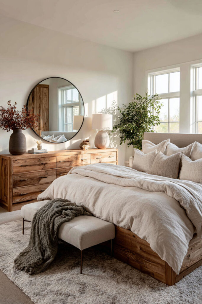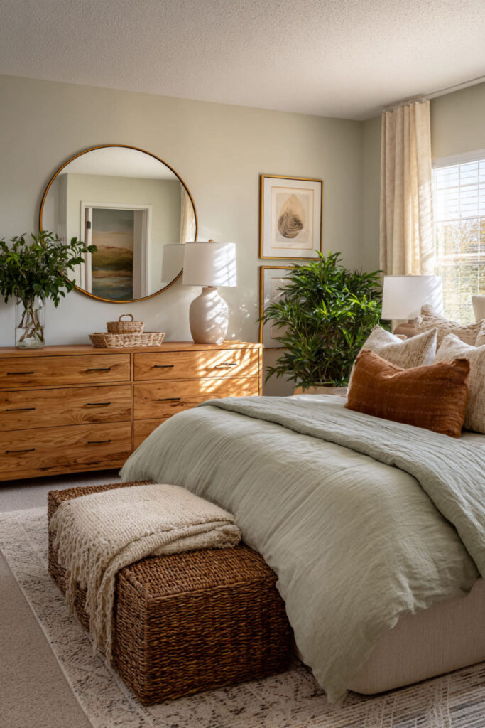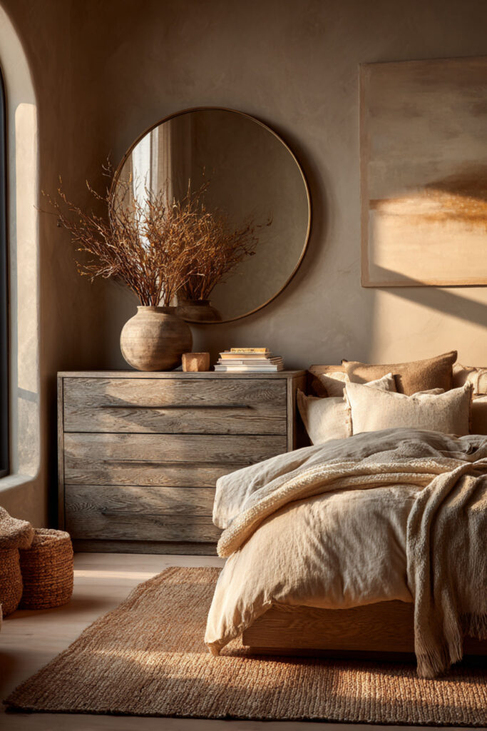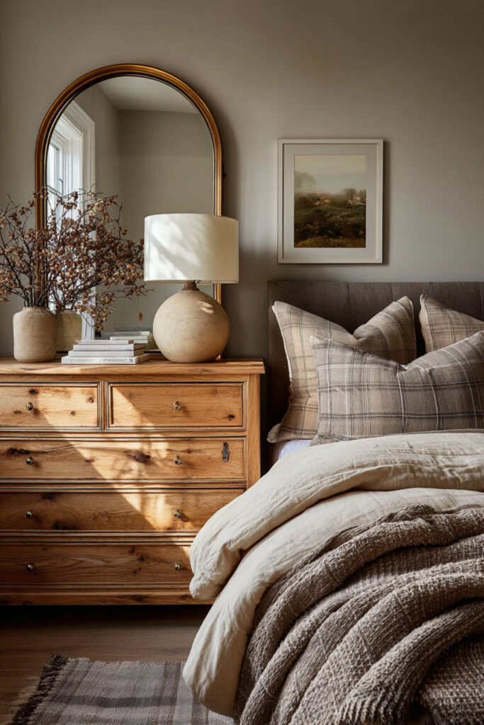 The top of a dresser is one of the most visible surfaces in the bedroom, and it’s also one of the most abused — a landing pad for receipts, loose change, water glasses, and whatever you pulled out of your pockets. Styling the dresser top intentionally prevents it from becoming a clutter magnet and turns it into a design feature. I recommend the three-object rule: a mirror (round, arched, or rectangular, leaning against the wall or hung above), a lamp or small stack of books for height variation, and one personal object — a small ceramic tray, a framed photo, or a single vase with greenery. Keep the rest of the surface empty. That negative space is what makes the arrangement look intentional. This how to style a dresser idea is the difference between a bedroom that looks “decorated” and a bedroom that looks lived-in with purpose.