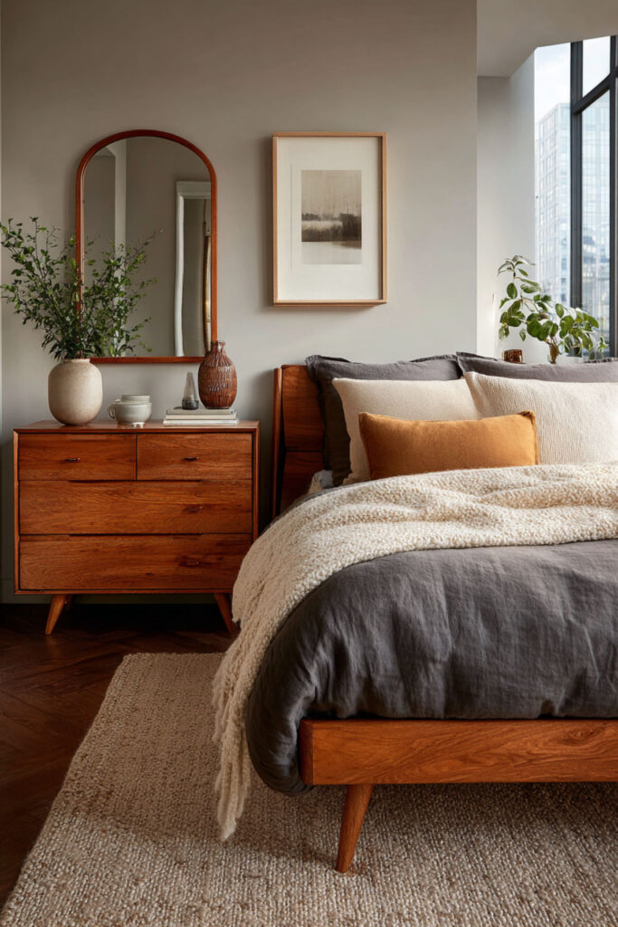 There’s a difference between furniture that matches and furniture that’s cohesive. A matching bedroom set — where every piece is from the same collection in the same finish — can feel dated and predictable, like a hotel room. Cohesive furniture shares a visual language (same wood tone, similar hardware style, complementary proportions) without being identical. I recommend choosing a dresser and nightstands in the same wood family (walnut dresser with walnut-toned nightstands, for example) but from different collections or even different eras. A mid-century walnut dresser paired with a simpler, more contemporary walnut nightstand creates a curated, collected look that feels intentional rather than catalog-ordered. This bedroom dresser and nightstand ideas concept is how designers build rooms that feel personal — not by matching, but by harmonizing.