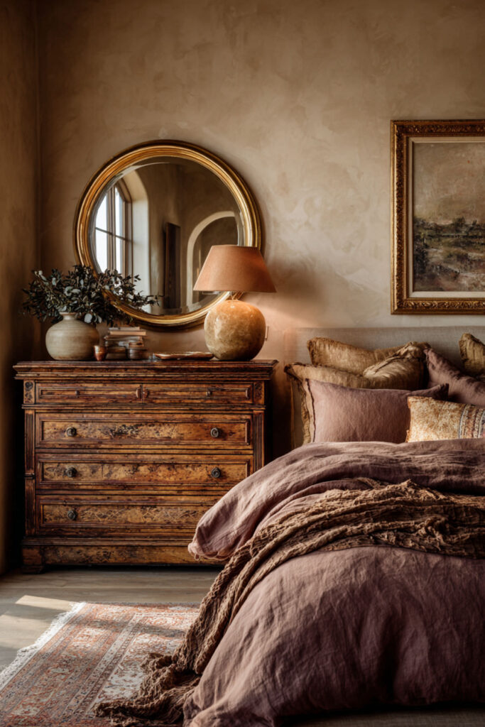 There is a quality to antique furniture that new pieces simply cannot replicate — the patina of decades of use, the slight imperfections in the wood, the hardware that shows its age, the feeling that this piece has lived a life and is ready to live another one. An antique dresser — solid oak, mahogany, or pine from the early to mid-twentieth century — brings depth and soul to a bedroom in a way that nothing from a catalog can match. I recommend searching estate sales, antique shops, or online vintage marketplaces for an antique solid wood dresser with original hardware and functional drawers. Check for structural soundness (no wobbling, drawers slide smoothly) and don’t worry about surface imperfections — they’re part of the charm. This antique dressers bedroom idea aligns perfectly with the 2026 shift toward free-standing, character-rich furniture that tells a story.