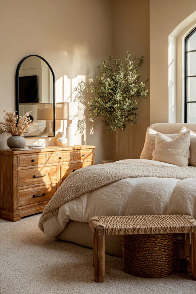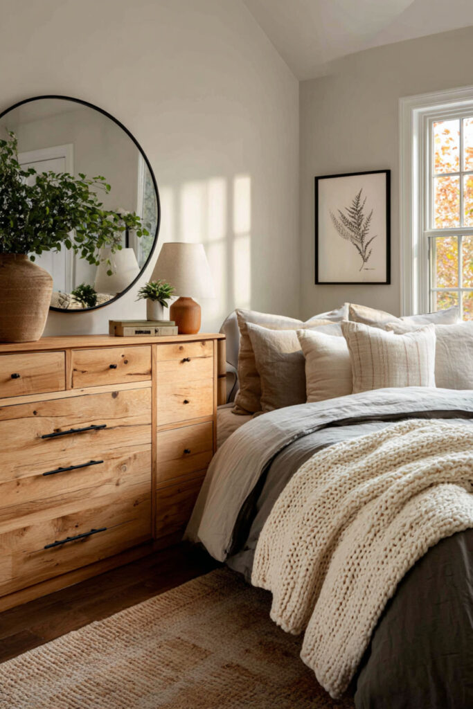 Dark furniture in a bedroom can feel heavy — grounding, yes, but also weighty in a space meant for rest. A light wood dresser — birch, maple, white oak, or ash — opens the room up. It reflects more light, feels less visually demanding, and creates an airy quality that makes the bedroom feel like a retreat rather than a den. I recommend a light wood dresser in a natural or matte finish with clean lines and simple hardware — brass or brushed nickel knobs work beautifully against light wood tones. Avoid anything too yellow or too orange; the best light wood finishes have a slightly cool or neutral undertone. This light wood dressers bedroom idea is especially powerful for bedrooms with limited natural light, where a dark dresser would absorb what little brightness exists.