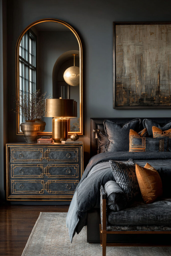 Art Deco is one of those styles that never fully leaves — it retreats for a few years and then resurfaces with the same geometric confidence it had in the 1920s. An Art Deco bedroom dresser features bold geometric lines, often with contrasting wood veneers, metallic accents (gold, brass, or chrome), and symmetrical hardware. The effect is glamorous without being fussy — structured elegance that feels both historical and completely modern. I recommend an Art Deco-inspired dresser with geometric drawer fronts, brass or gold pulls, and a warm wood or lacquer finish. Look for proportions that feel substantial — Art Deco furniture should have presence. This Art Deco bedroom dresser idea is for the woman who wants her bedroom to feel like a curated space with a point of view — not a showroom, but a room that’s been thought about.