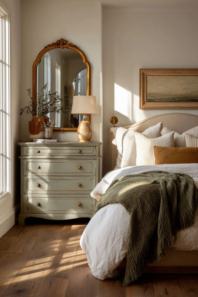 The modern vintage look takes a traditional dresser shape — curved legs, multiple drawers, a slightly ornate silhouette — and updates it with a contemporary finish: matte paint, fresh hardware, or a simplified color palette. The result is a piece that feels both familiar and new, like something your grandmother might have owned if she’d had a Pinterest account. I recommend a vintage-shaped dresser with updated hardware (gold bar pulls or simple round knobs in brass) and a finish in muted sage, soft blue-grey, warm white, or natural wood. The shape provides character; the finish provides calm. This modern vintage dresser idea is for women who love the warmth of traditional furniture but want it to feel current and clean in their refreshed bedroom.
