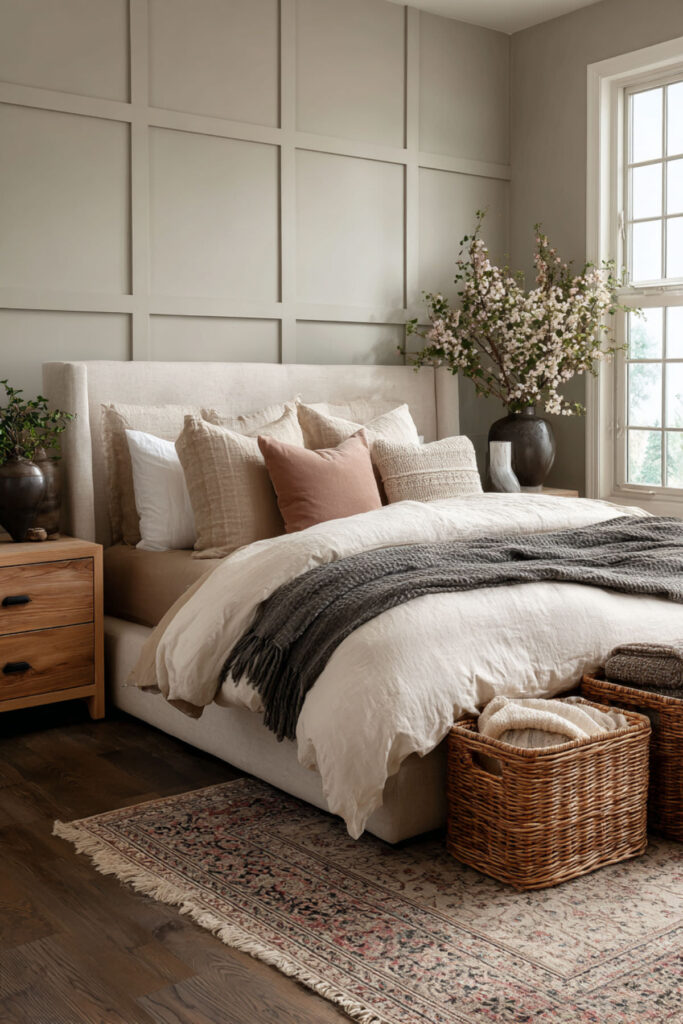 15. Beige Upholstered Bed with Storage: Neutral and Grounding