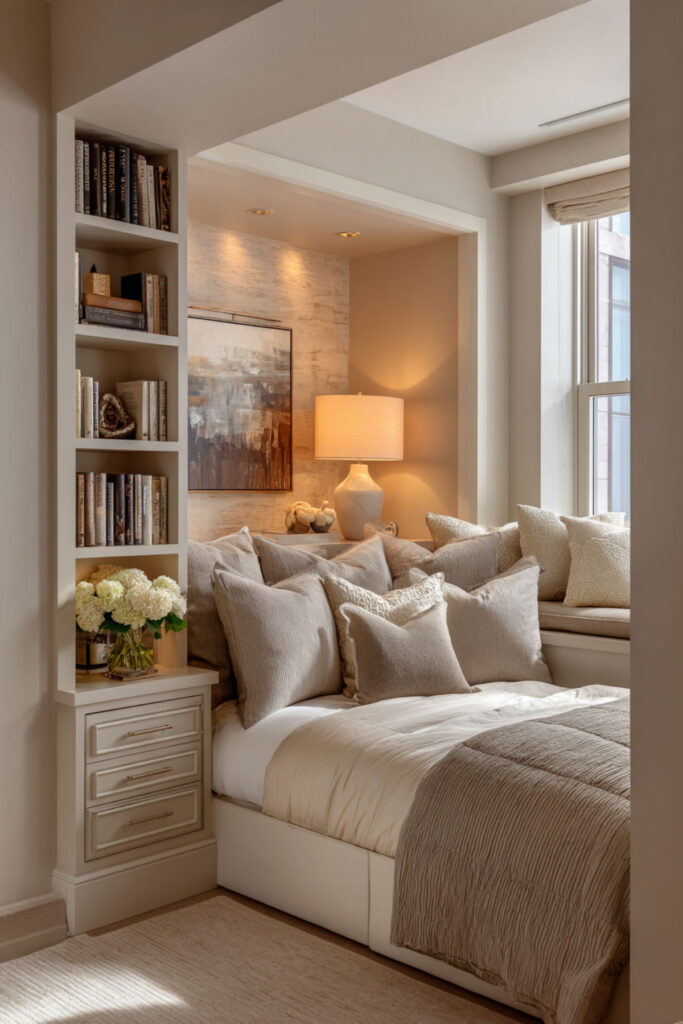 There’s something about a cream upholstered bed that makes a small room feel larger, brighter, and more luxurious than it is. The light color reflects light, the soft fabric adds warmth, and when the frame has hidden storage drawers or a lift-up mechanism, the bed becomes the hardest-working piece of furniture in the room while looking like the most effortless. I really recommend a cream or oatmeal linen upholstered storage bed with a gently curved headboard — the curve softens the geometry of a small room and the light color keeps things visually open. Pair it with white or warm neutral bedding and the room feels calm and cohesive. This cream upholstered storage bed idea is proof that functional furniture can also be the most beautiful thing in the room.