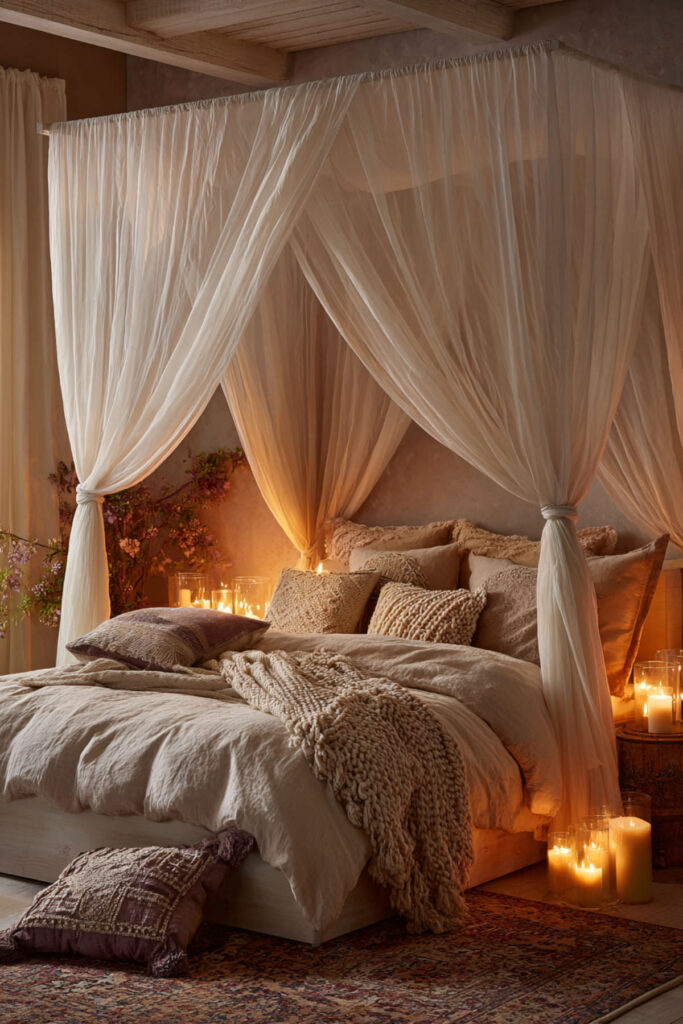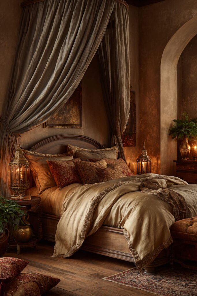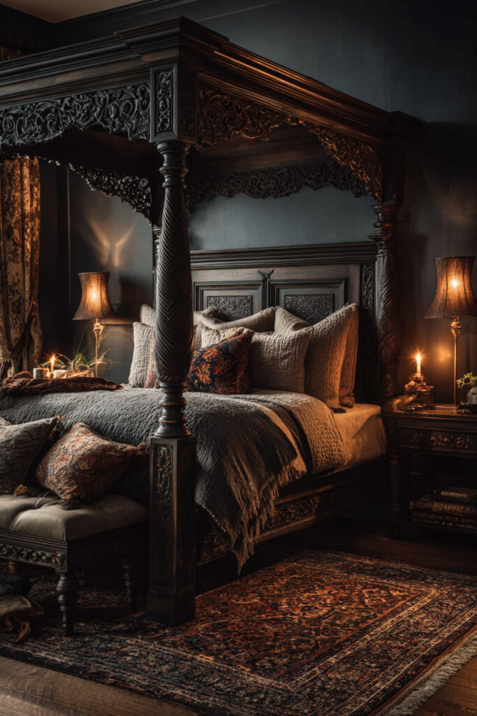 For the woman whose romantic aesthetic runs darker — who loves candlelight, deep colors, velvet, and the drama of shadows — a gothic four-poster canopy bed is the statement piece that transforms the bedroom into something out of a novel. Think tall, dark posts in wrought iron or stained wood. Heavy drapes in deep plum, charcoal, or black. Bedding in layers of dark jewel tones. The evening ambience here isn’t soft and airy — it’s enveloping, atmospheric, and deeply dramatic. I recommend a tall wrought-iron four-poster canopy bed in matte black with dark velvet or heavy linen drapes tied at each post. Add a few candles on the nightstand (real or flameless) and keep the rest of the room in dark, moody tones. This gothic four poster canopy beds idea is the most emotionally bold option on this list — and for the right woman, it’s the most romantic.