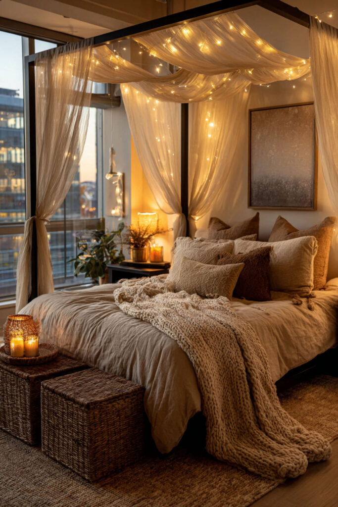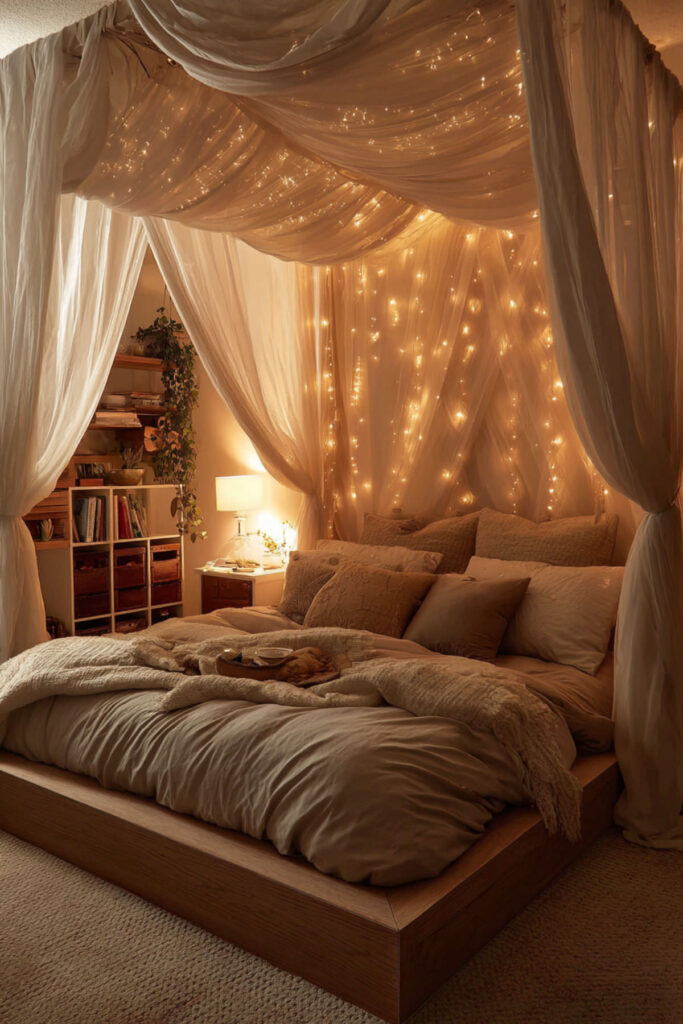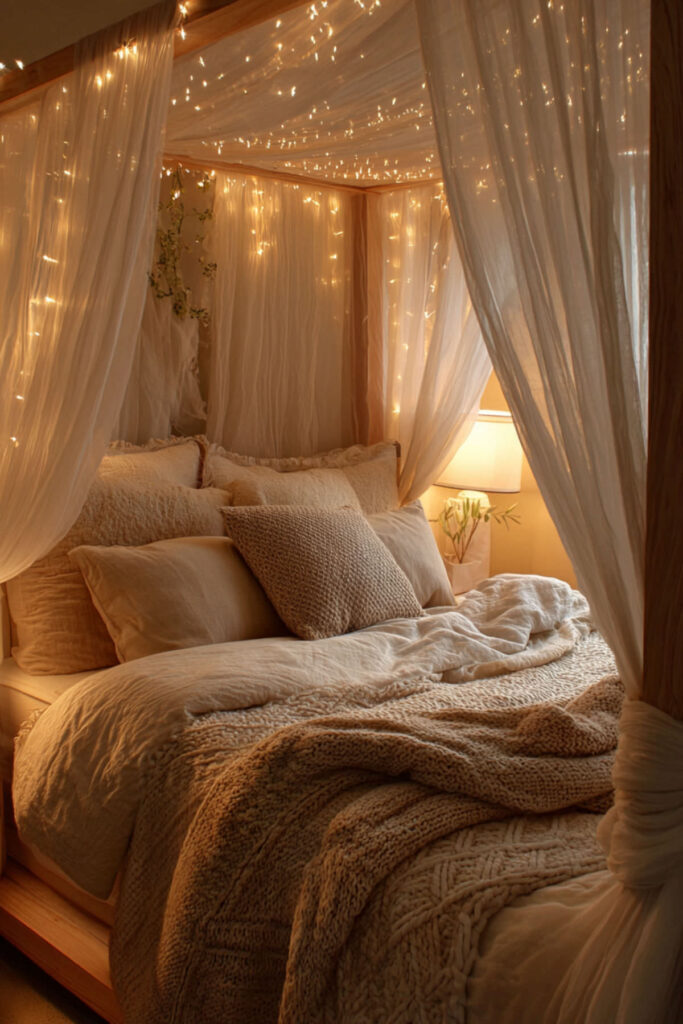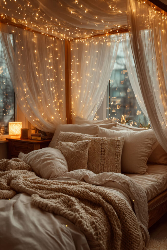3. Canopy Bed with Fairy Lights: Warm Glow Without Overhead Lighting