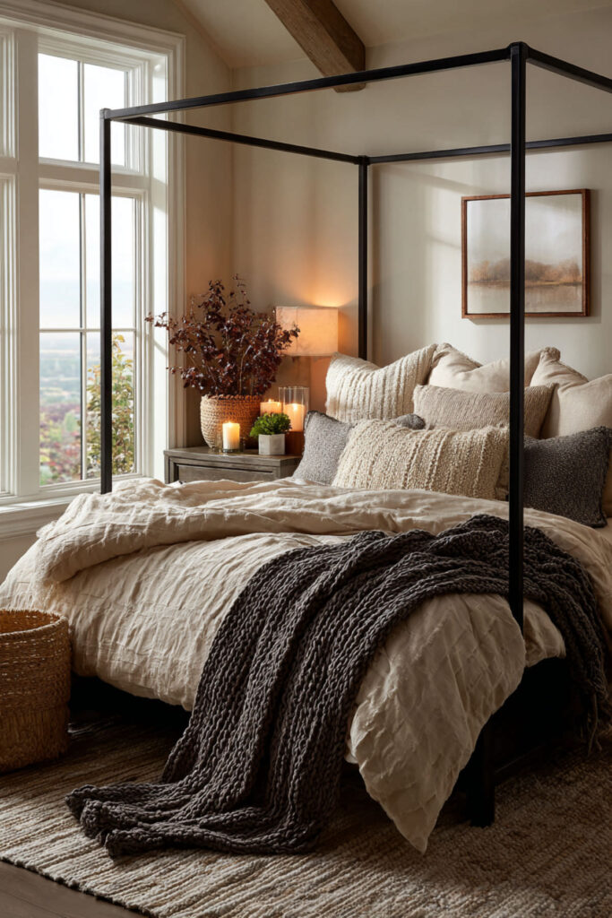You might think a canopy bed requires a large bedroom, but the opposite can be true — in a small room, a canopy bed actually enhances the coziness by leaning into the intimacy of the space rather than fighting it. The key is choosing a slim frame that doesn’t overwhelm the room. Designer Jenny Bova has noted that modified canopies — upholstered cornice boards with drapery panels — work beautifully in small spaces, creating a focal point without consuming floor area. I recommend a slim metal canopy bed frame in queen size for small bedrooms, paired with sheer or lightweight linen panels on the headboard side only. This keeps the romantic feel while leaving three sides open for a less enclosed, more breathable look. This cozy canopy bed idea is proof that small rooms aren’t a limitation — they’re an invitation to create something more intimate.