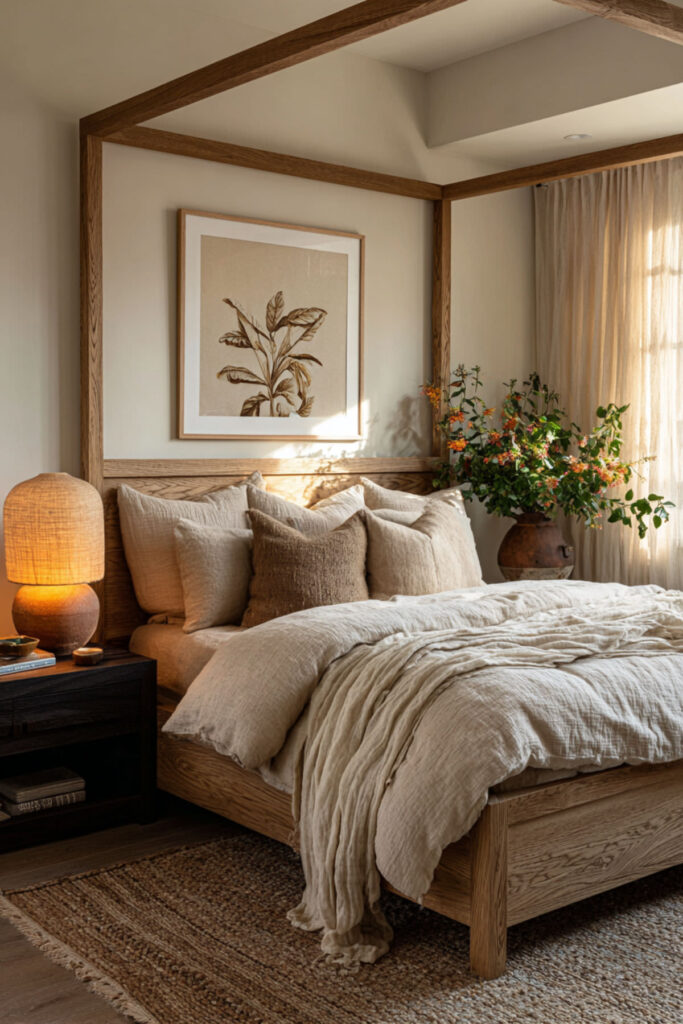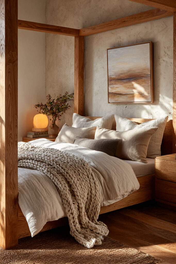 Where metal canopy beds feel graphic, wood canopy beds feel grounding. A canopy frame in light or medium-toned wood — oak, birch, ash, or teak — brings organic warmth into the bedroom and creates a sense of being held by something natural. The grain and texture of real wood make the frame feel handmade and personal, even when it’s not. I recommend a wood canopy bed in a natural or honey-toned finish with clean, slightly tapered posts — nothing too bulky, nothing too ornate. The goal is a frame that feels like part of the room’s architecture, not a piece of furniture placed on top of it. This wood canopy bed idea connects to the broader biophilic design movement in 2026, where natural materials are used not just for aesthetics but for how they make people feel — calmer, more grounded, more at home.