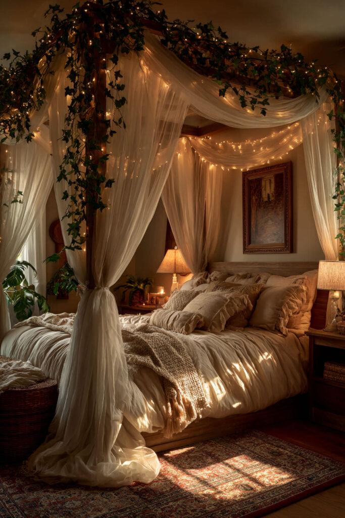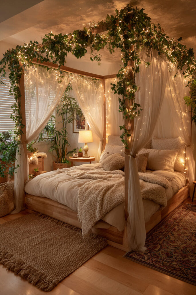 8. Canopy Bed with Lights and Greenery: A Living Retreat