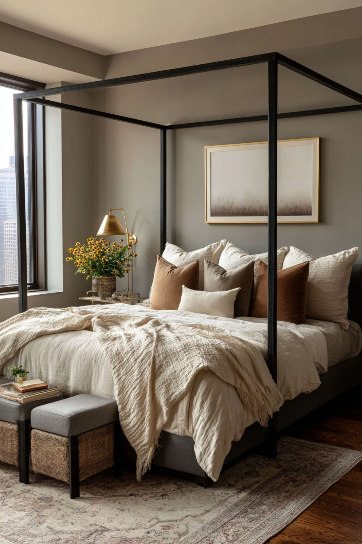 You might think a canopy bed requires a large bedroom, but the opposite can be true — in a small room, a canopy bed actually enhances the coziness by leaning into the intimacy of the space rather than fighting it. The key is choosing a slim frame that doesn’t overwhelm the room. Designer Jenny Bova has noted that modified canopies — upholstered cornice boards with drapery panels — work beautifully in small spaces, creating a focal point without consuming floor area. I recommend a slim metal canopy bed frame in queen size for small bedrooms, paired with sheer or lightweight linen panels on the headboard side only. This keeps the romantic feel while leaving three sides open for a less enclosed, more breathable look. This cozy canopy bed idea is proof that small rooms aren’t a limitation — they’re an invitation to create something more intimate.