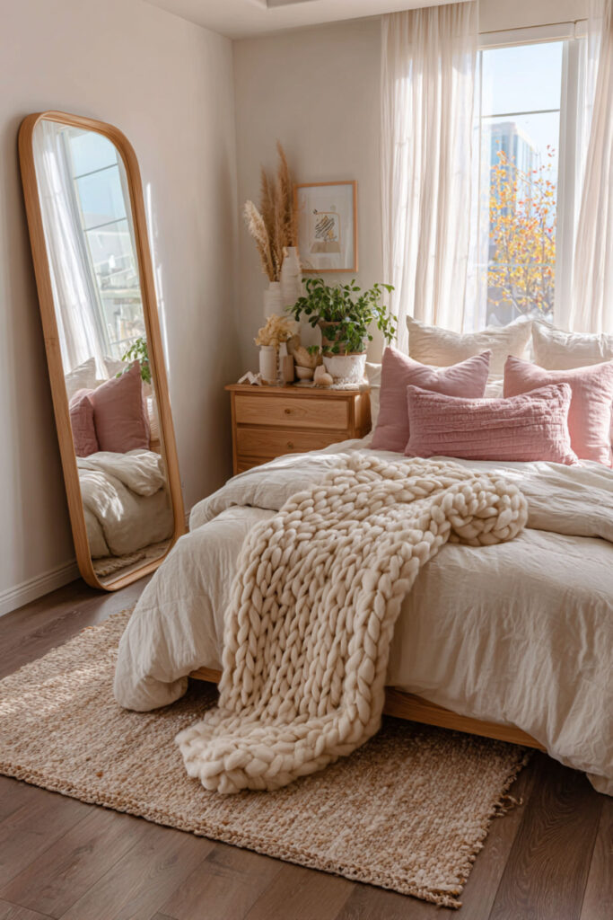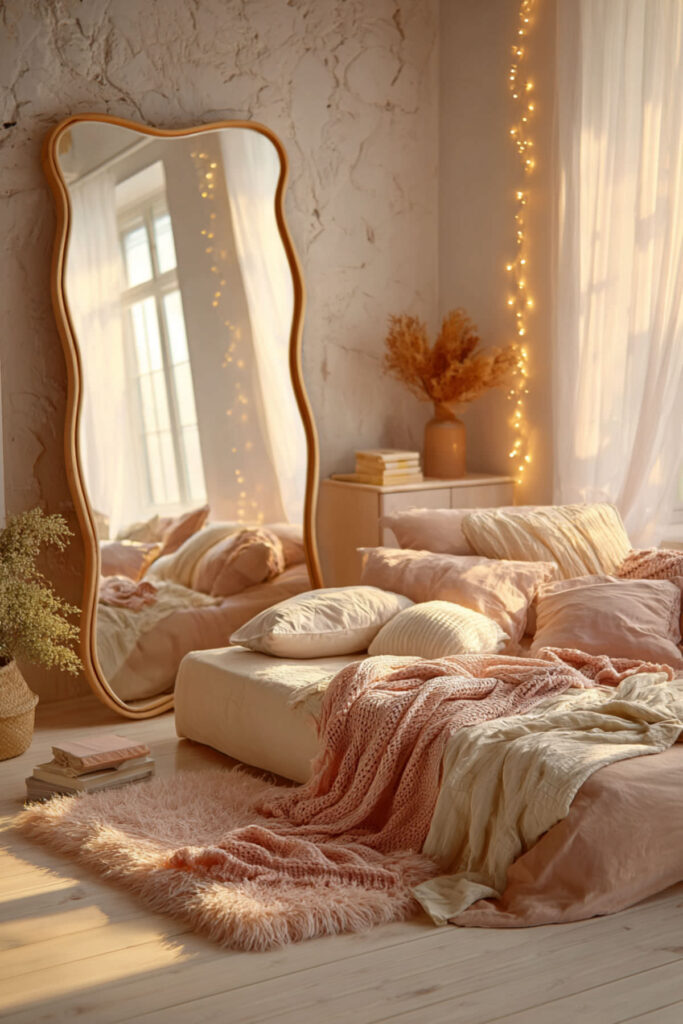 Let’s start with the most impactful option. An oversized floor mirror leaning against your wall isn’t just functional — it’s a whole vibe. It creates depth, reflects light, and makes your room look twice as big in photos.