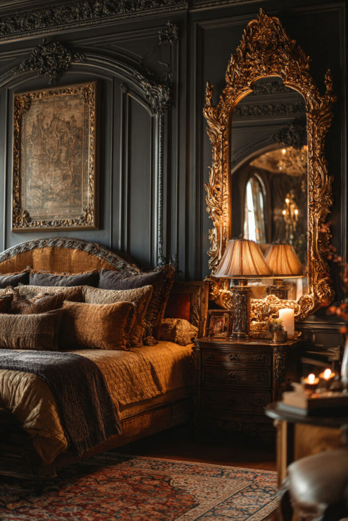 I really recommendVictorian mirrors with heavy, detailed frames in darker finishes like bronze or deep gold. These work best as statement pieces — one amazing mirror rather than several competing for attention. This is fancy mirror territory that goes all the way.