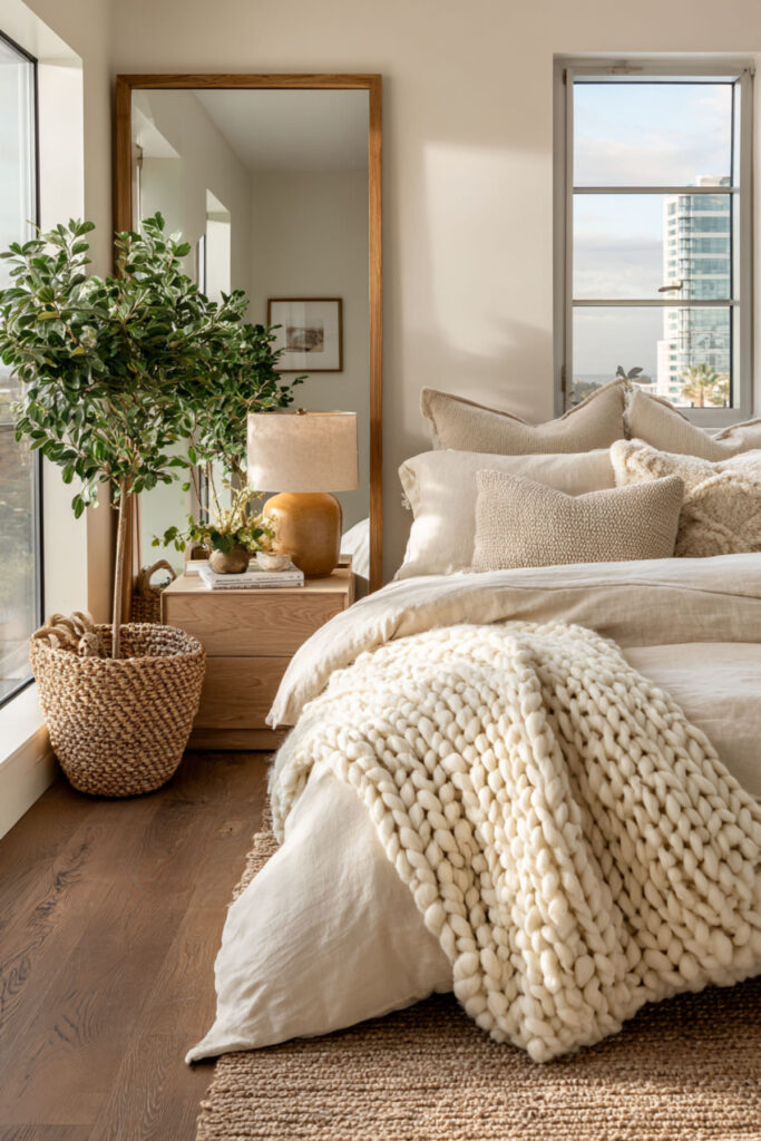 I really recommend a large gold mirror for bedrooms with cooler tones that need some warmth, or for spaces that don’t get much natural light. The gold acts like a permanent warm filter on your whole room. This is gold mirror bedroom aesthetic that works with basically any style.