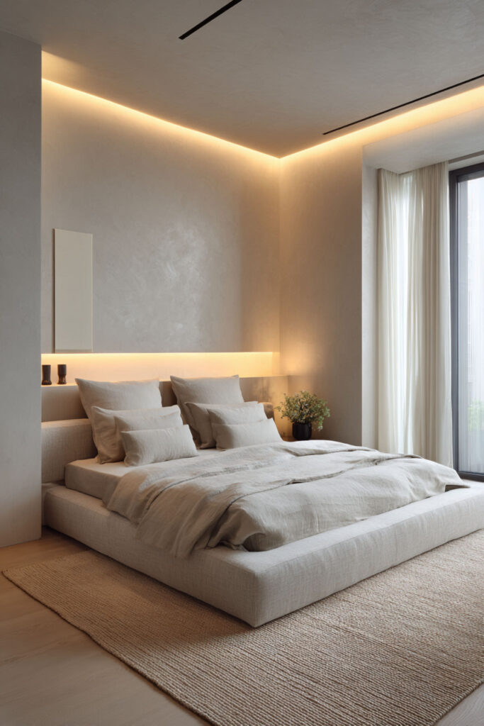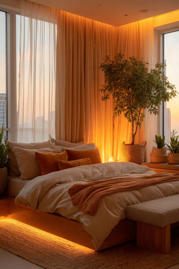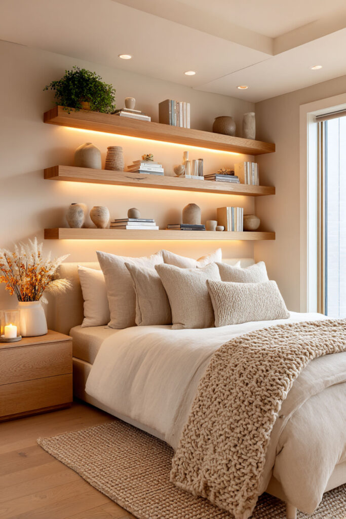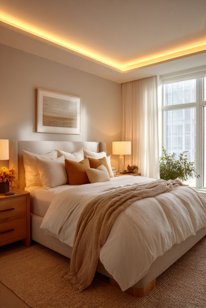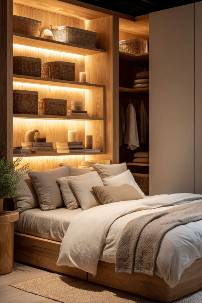 This one is purely practical and entirely life-changing. LED strips mounted inside your closet — along the top edge, inside the door frame, or along each shelf — give you full visibility of every piece of clothing you own. No more pulling out three black tops because you couldn’t tell which one was which in the dark. The light activates when you open the door (if you use a motion-sensor strip or a door-activated switch) and turns your closet into something that actually functions like a closet should. I recommend warm white LED strips with a motion sensor or door-trigger switch mounted along the top interior edge of the closet, angled downward. This hidden led strip lighting bedroom idea isn’t about aesthetics — it’s about never wearing the wrong shirt because your closet lighting was garbage.