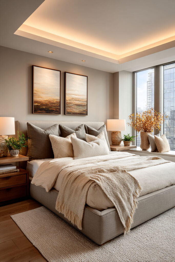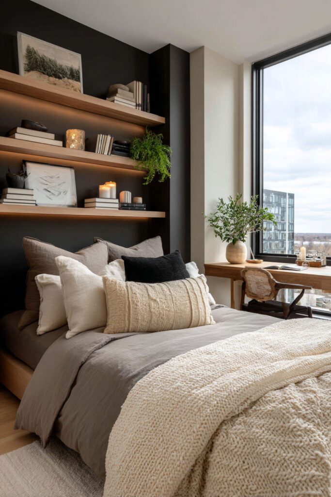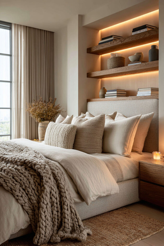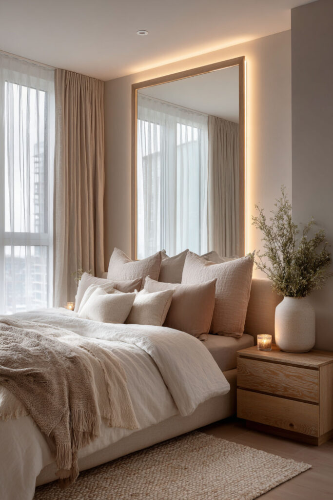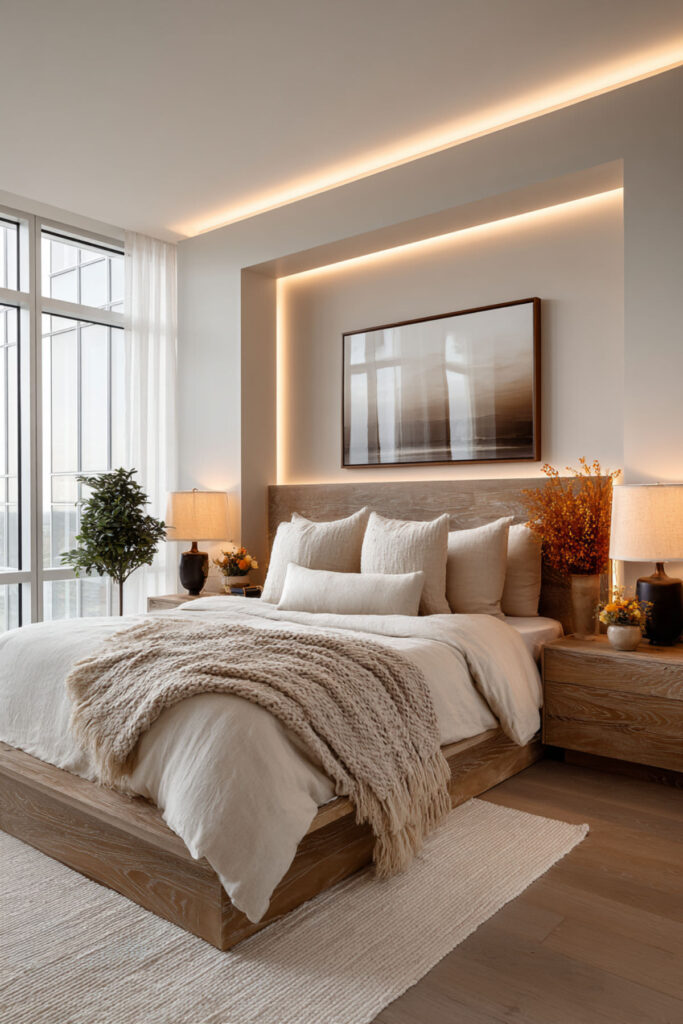 This one is purely practical and entirely life-changing. LED strips mounted inside your closet — along the top edge, inside the door frame, or along each shelf — give you full visibility of every piece of clothing you own. No more pulling out three black tops because you couldn’t tell which one was which in the dark. The light activates when you open the door (if you use a motion-sensor strip or a door-activated switch) and turns your closet into something that actually functions like a closet should. I recommend warm white LED strips with a motion sensor or door-trigger switch mounted along the top interior edge of the closet, angled downward. This hidden led strip lighting bedroom idea isn’t about aesthetics — it’s about never wearing the wrong shirt because your closet lighting was garbage.