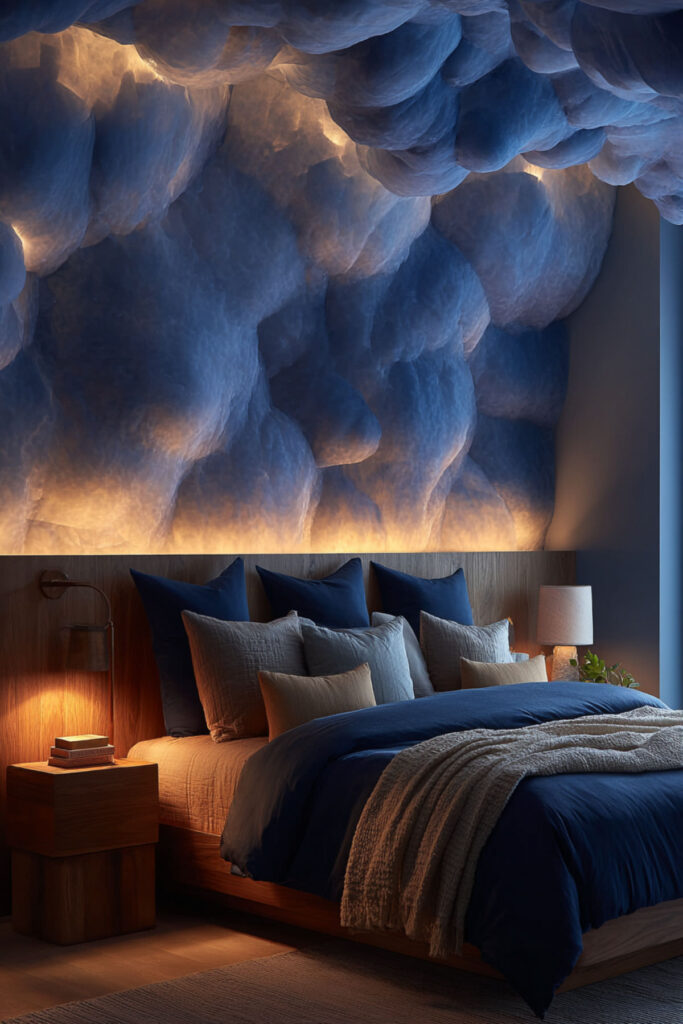 This is the most dramatic setup on the list, and it’s earned its viral status. An LED cloud ceiling uses polyester fiberfill (the same batting used for pillow stuffing) attached to a panel or directly to the ceiling, with LED strip lights hidden inside and behind the fluff. The result looks like glowing storm clouds on your ceiling — ethereal, moody, and completely unique. With RGB strips, you can make the clouds shift colors, pulse with music, or glow in soft pastels. I recommend starting with a foam board or cardboard panel as a base, attaching polyester fiberfill with hot glue or spray adhesive, and weaving RGB LED strips through the batting. Mount the panel with Command strips if you rent. Start with one cloud cluster over your bed before committing to a full ceiling. This led cloud lights and ceiling clouds with lights idea is the project that will get the most compliments and the most questions — it takes about two hours and the materials cost under thirty dollars.