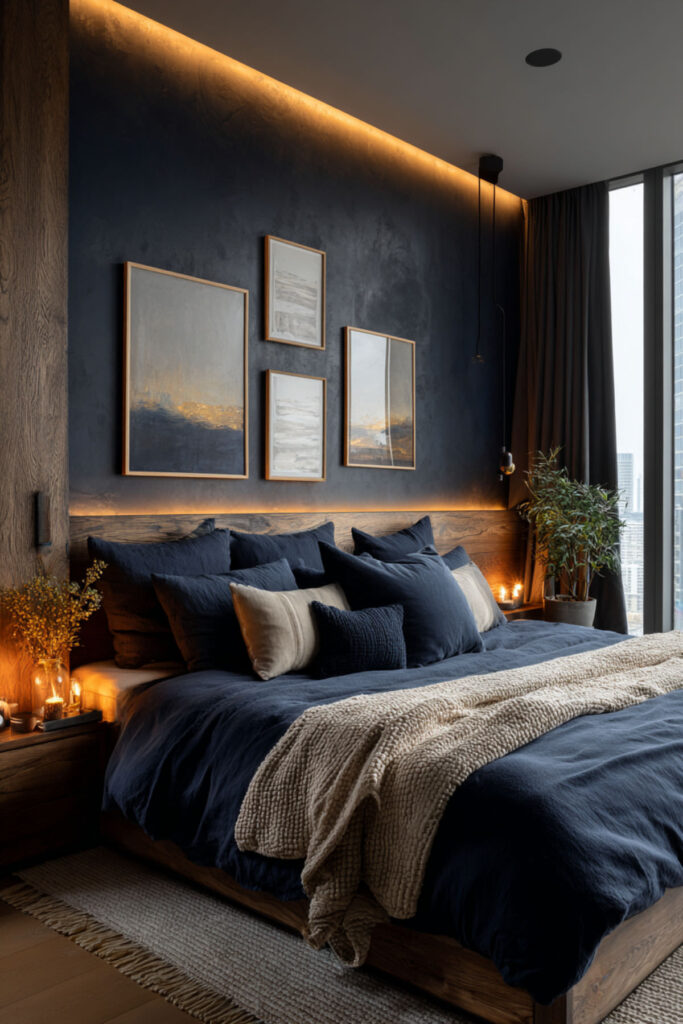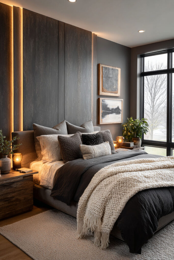 An accent wall with LED strips creates depth and drama that paint alone can’t achieve. The most common approach: vertical LED strips mounted in channels on a single wall (usually behind the bed), spaced evenly apart, creating a lined or paneled glow effect. Alternatively, you can mount strips behind wood slat panels or inside recessed channels for a built-in architectural look. The light adds a third dimension to the wall — it’s not flat anymore, it glows. I recommend RGB LED strips mounted in slim aluminum channels on the accent wall, spaced 8 to 12 inches apart vertically, or hidden behind wood slat panels for a cleaner look. This accent wall with led lights idea transforms one wall into the focal point of the entire room, and the color-changing capability means you’re never locked into one aesthetic.