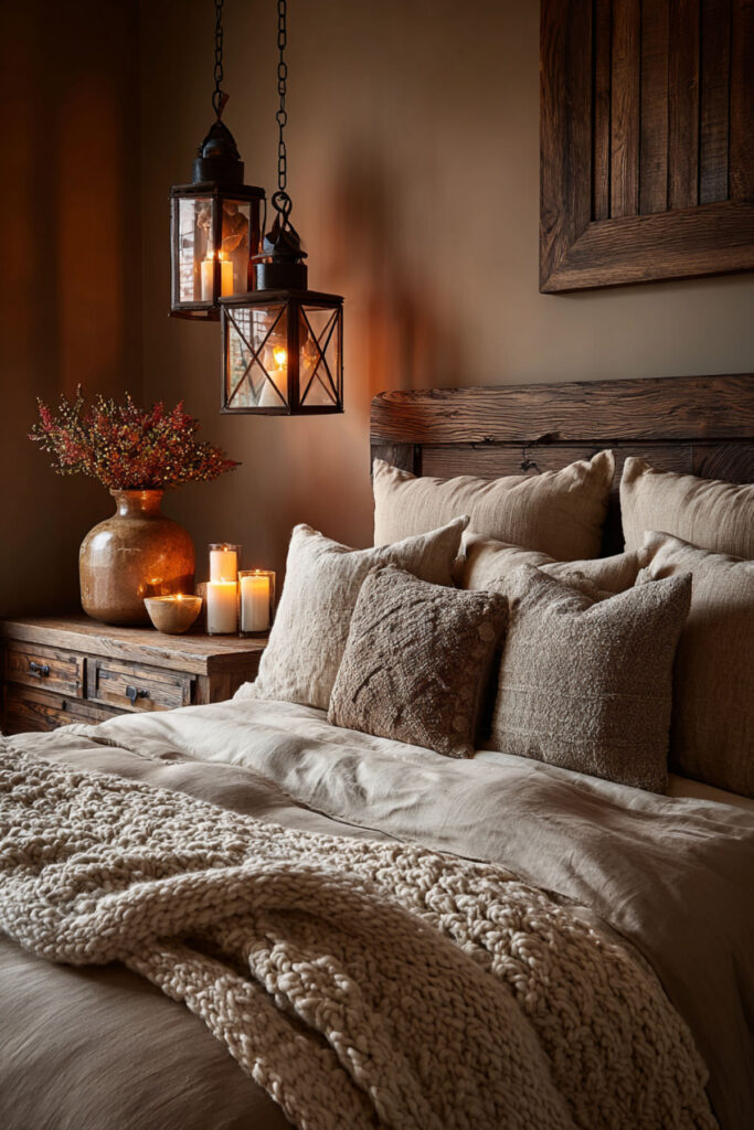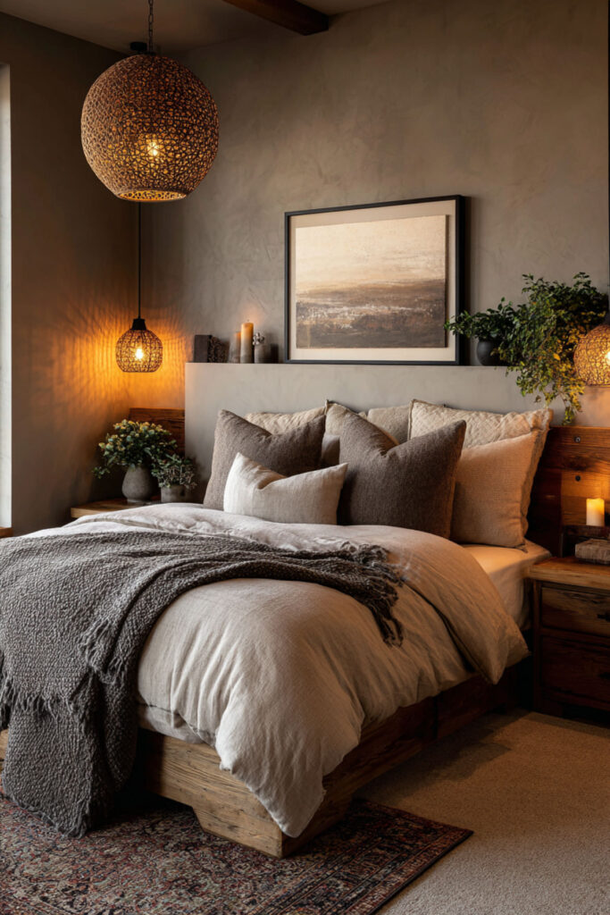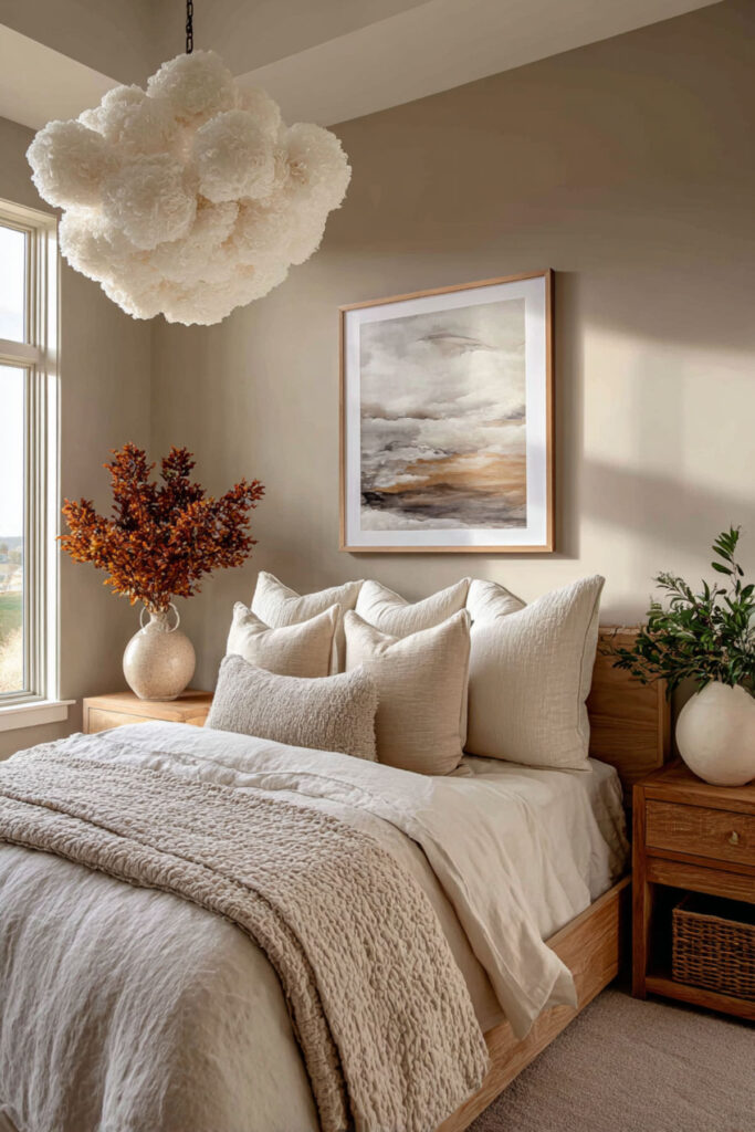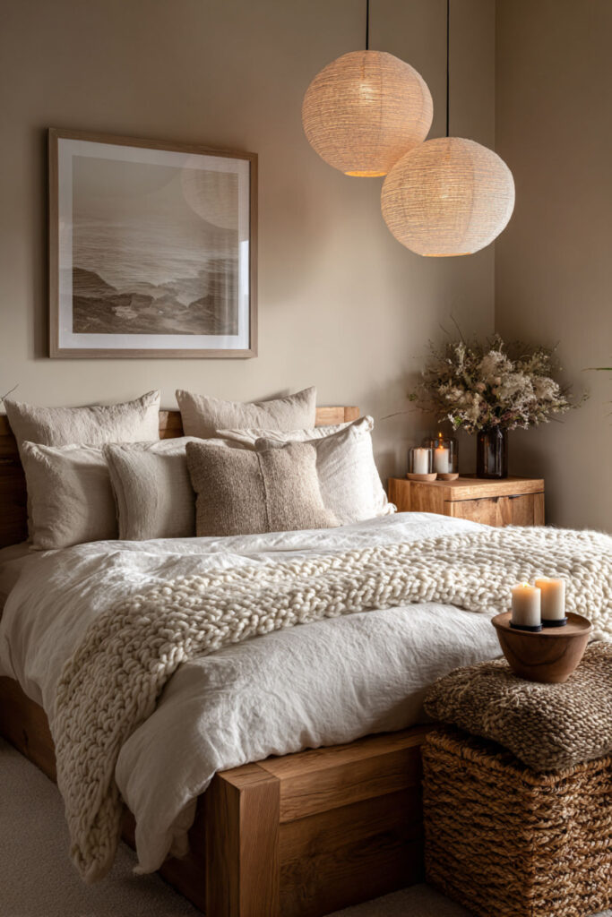 If you’ve been following interior design trends at all, you’ve probably noticed a real shift toward wabi sabi style lighting — and honestly? It’s one of my favorites. The idea is rooted in Japanese philosophy: things that are imperfect, organic, and honest are beautiful. So you’ll find linen shades, raw ceramic bases, uneven hand-thrown forms. This style of modern wabi sabi lighting doesn’t try to be flashy, and that’s exactly the point. There’s something cozy about the way a matte ceramic pendant casts soft shadows across a neutral wall. It creates a bedroom that feels like it’s been curated over years, not assembled in a weekend. I strongly recommend a handmade ceramic pendant light or a wabi sabi table lamp with an organic silhouette for this vibe — it’ll make your room feel grounded in the best way.