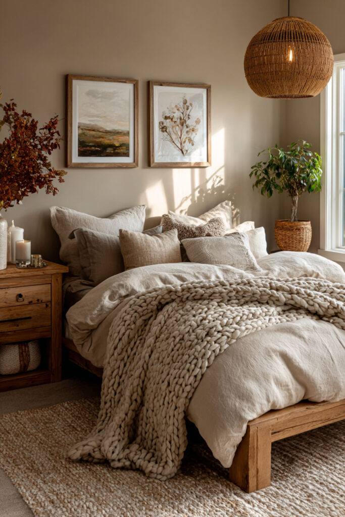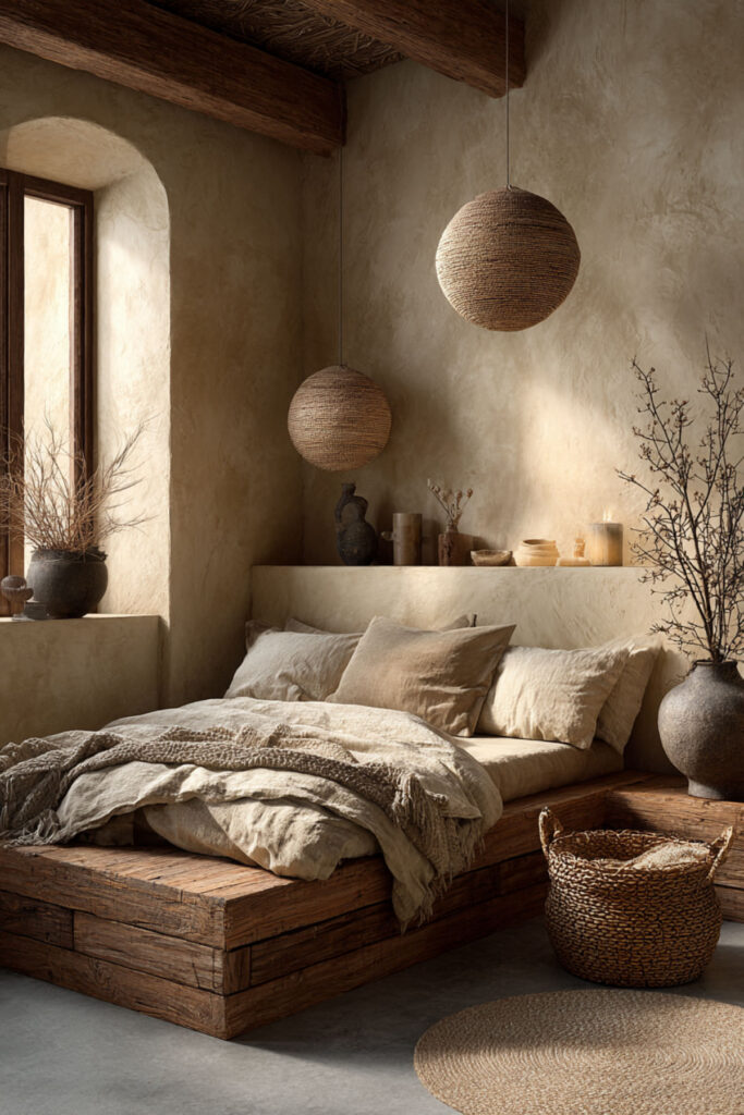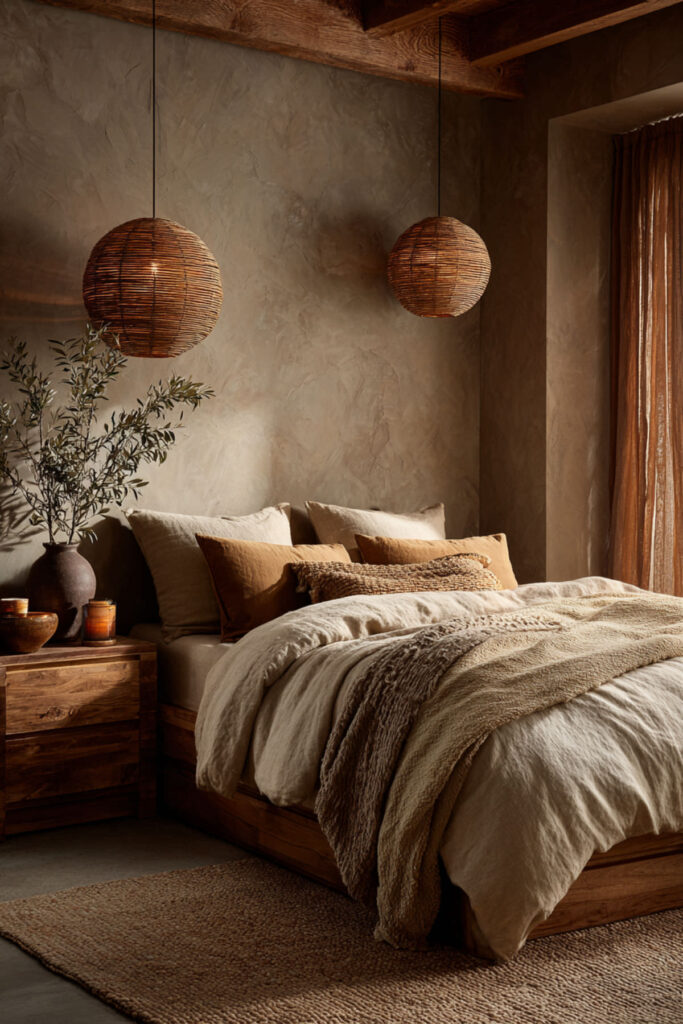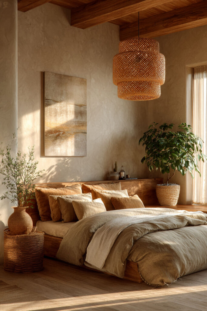 Natural chandeliers — think woven rattan, dried botanicals, carved wood, or handwoven rope — bring something into the bedroom that you just can’t fake: texture. And texture is everything when you’re building a room that feels layered and calm. A handmade chandelier with natural materials catches the light differently than glass or metal, creating gentle, organic shadows that move subtly with air circulation. It’s the kind of fixture that makes a bedroom feel like it exists somewhere beautiful, maybe a coastal cottage or a carefully designed retreat. For anyone drawn to organic lighting fixtures, boho hanging lights, or the wabi sabi aesthetic, this is the direction I’d go. I strongly recommend a natural woven rattan chandelier or a hand-knotted rope pendant as the main bedroom ceiling light fixture — it’s truly unlike anything else.