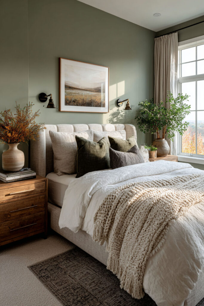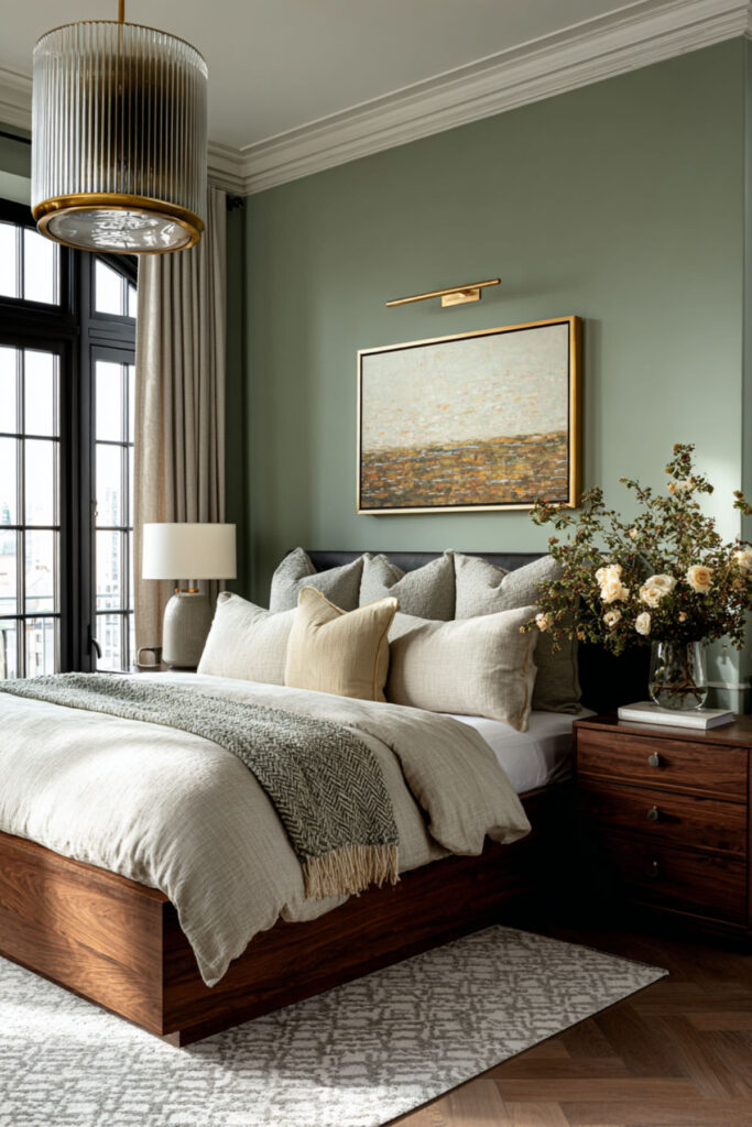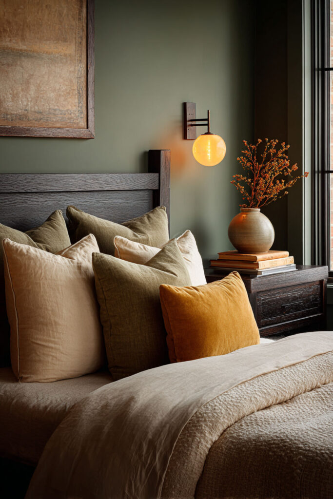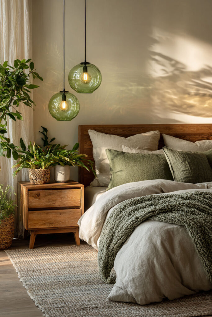 Okay, this one might surprise you — but green pendant lights are genuinely one of the most beautiful choices for a calm, elegant bedroom, and they’re trending hard right now. The key is the right shade of green: think deep forest, sage, or muted olive, not bright lime. Cozy green lighting creates an almost botanical quality in a room — it references nature without being literal, and it pairs beautifully with warm wood tones, cream linens, and brass accents. This option works really well above a reading nook or bedside area, where you want ambient light with a bit of personality. I really recommend a ceramic or glass pendant in a deep sage or forest green glaze — it’s one of those additions that makes a room feel completely intentional and quietly beautiful.