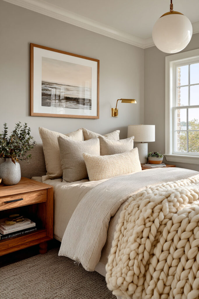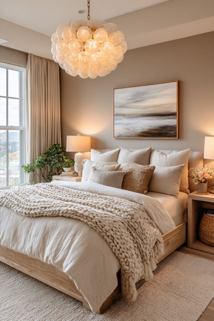 Okay, I used to think chandeliers were only for dining rooms or enormous Victorian mansions. I’ve totally changed my mind. A globe chandelier in the bedroom is one of those moves that just works — it anchors the room, adds instant warmth, and looks like something you’d see in a gorgeous spread in Architectural Digest. The rounded silhouette feels soft rather than dramatic, which is exactly what you want for a bedroom. Blown glass versions are especially beautiful because they catch and diffuse light in the most flattering way — think a gentle amber glow, not a spotlight. I really recommend a blown glass globe chandelier with a warm-toned bulb for this look. It pulls double duty as a ceiling light fixture and a piece of art you never have to take down.