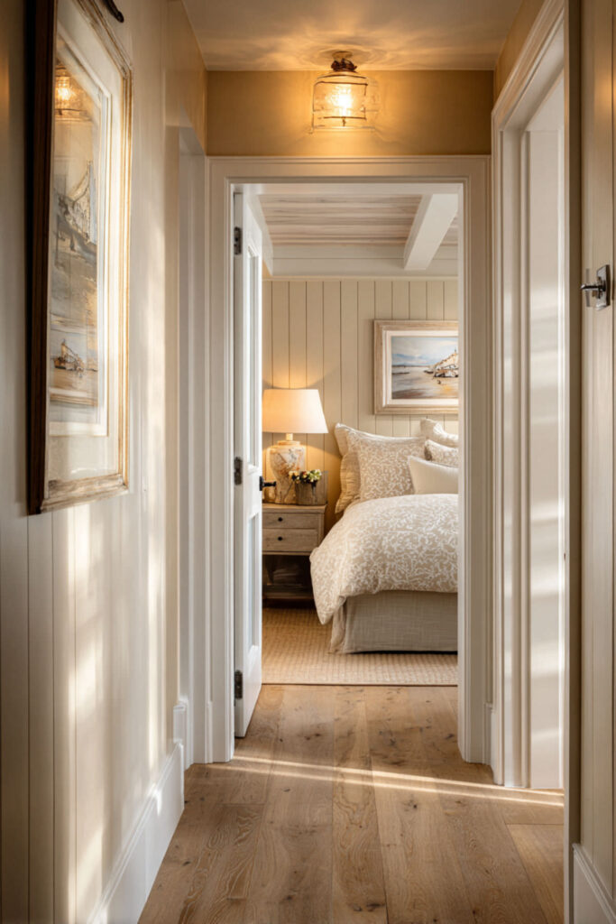 Here’s something that often gets completely overlooked: the hallway leading to your bedroom. The lighting out there matters. It sets the tone before you even open the door — and if it’s harsh or bright, it already works against the calm you’ve built inside. Small hallway lighting ideas don’t have to be boring. A single beautiful sconce, a small flush mount with a warm bulb, or even a plug-in pendant can completely transform an entryway hallway lighting situation. I especially love a smoked glass or frosted globe fixture for a hallway — it softens everything and creates a beautiful transition from the rest of the house into your sanctuary. I strongly recommend a small wall sconce in an amber or frosted finish for hallway lighting — it’s a tiny change with a surprisingly big impact on the overall feel of your space.
