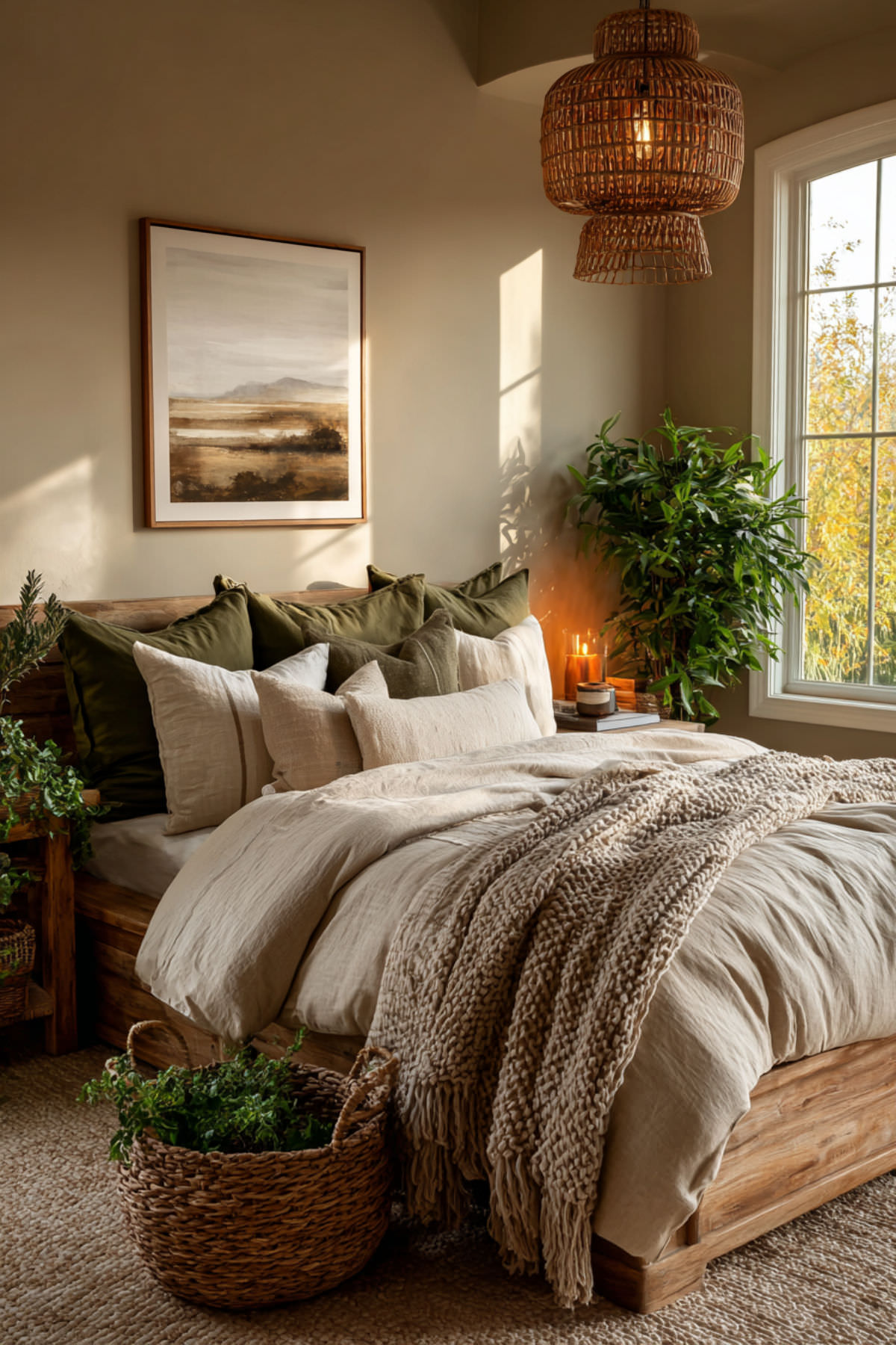 Natural chandeliers — think woven rattan, dried botanicals, carved wood, or handwoven rope — bring something into the bedroom that you just can’t fake: texture. And texture is everything when you’re building a room that feels layered and calm. A handmade chandelier with natural materials catches the light differently than glass or metal, creating gentle, organic shadows that move subtly with air circulation. It’s the kind of fixture that makes a bedroom feel like it exists somewhere beautiful, maybe a coastal cottage or a carefully designed retreat. For anyone drawn to organic lighting fixtures, boho hanging lights, or the wabi sabi aesthetic, this is the direction I’d go. I strongly recommend a natural woven rattan chandelier or a hand-knotted rope pendant as the main bedroom ceiling light fixture — it’s truly unlike anything else.