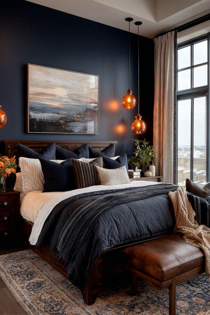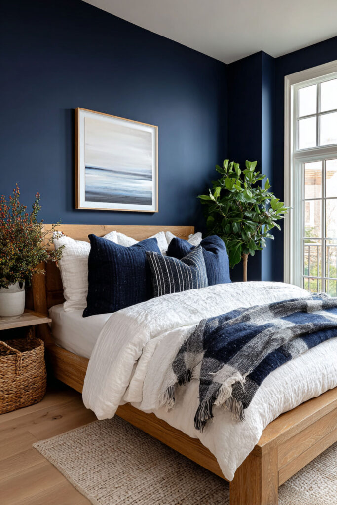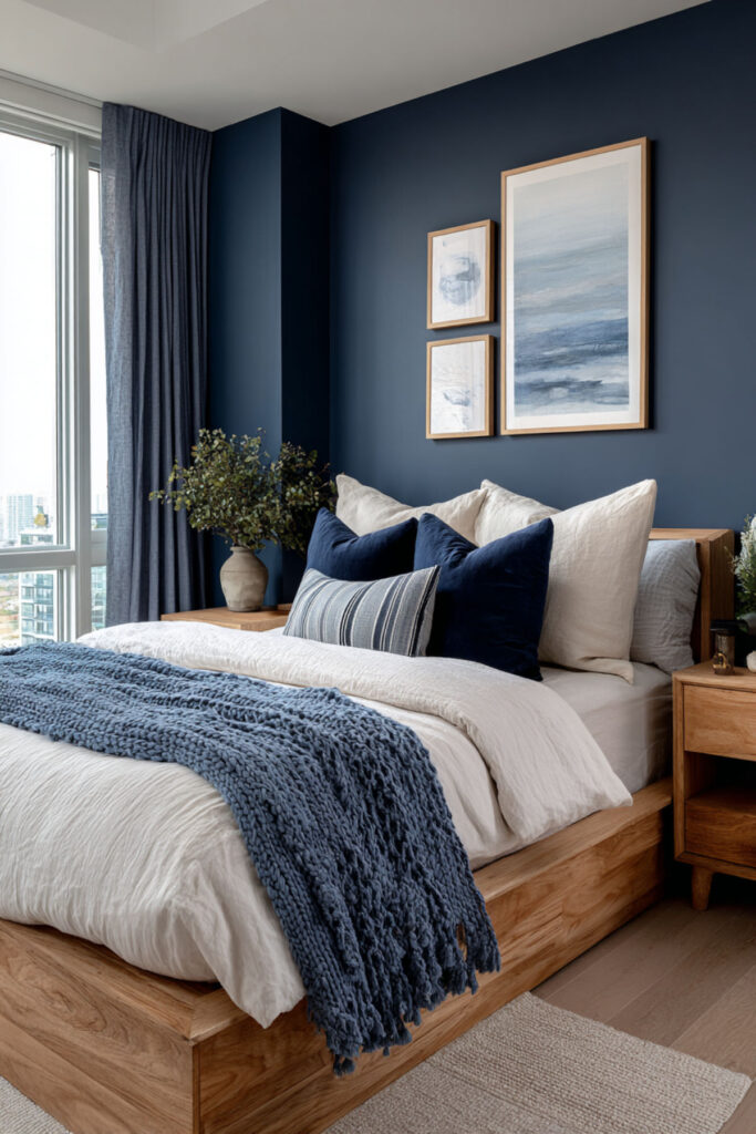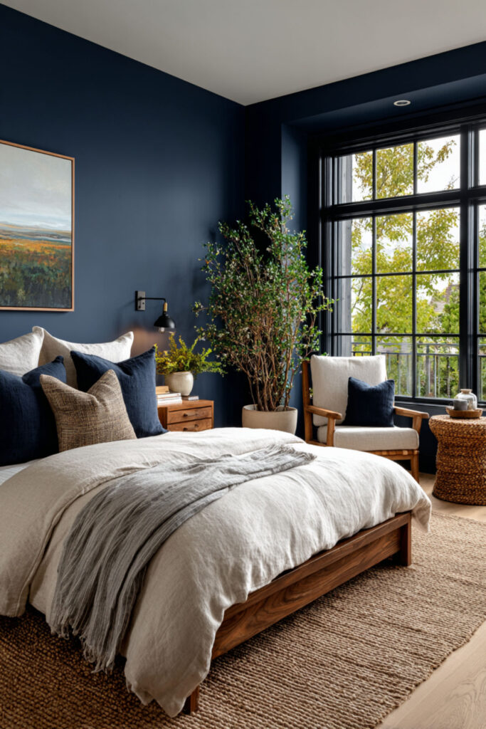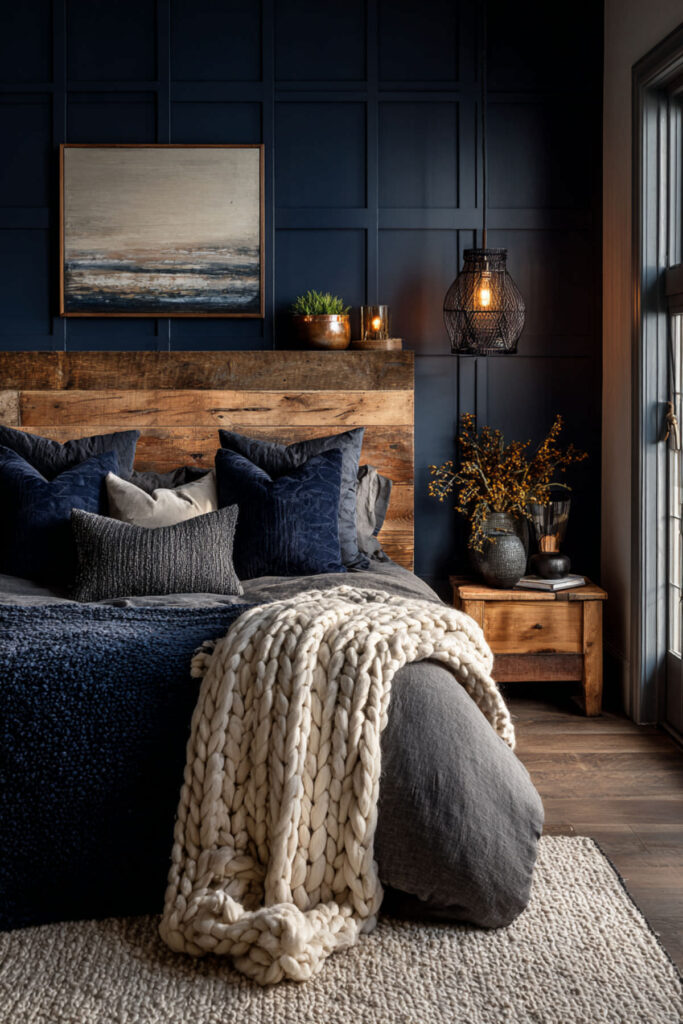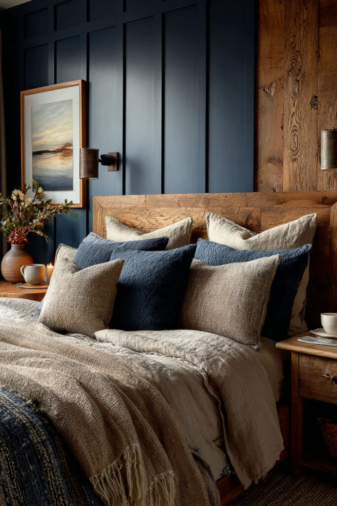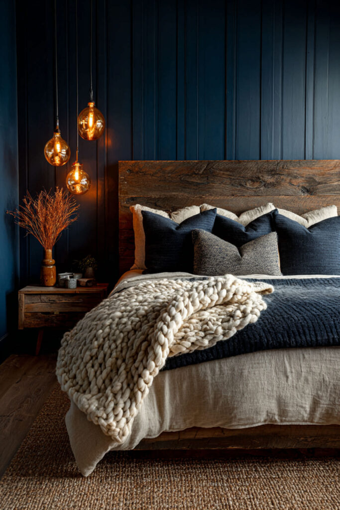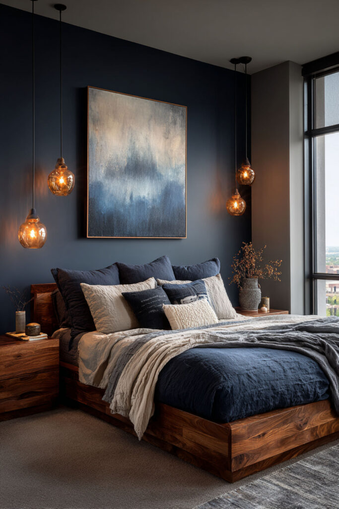 Midnight Blue Bedroom with Warm Wood Accents
