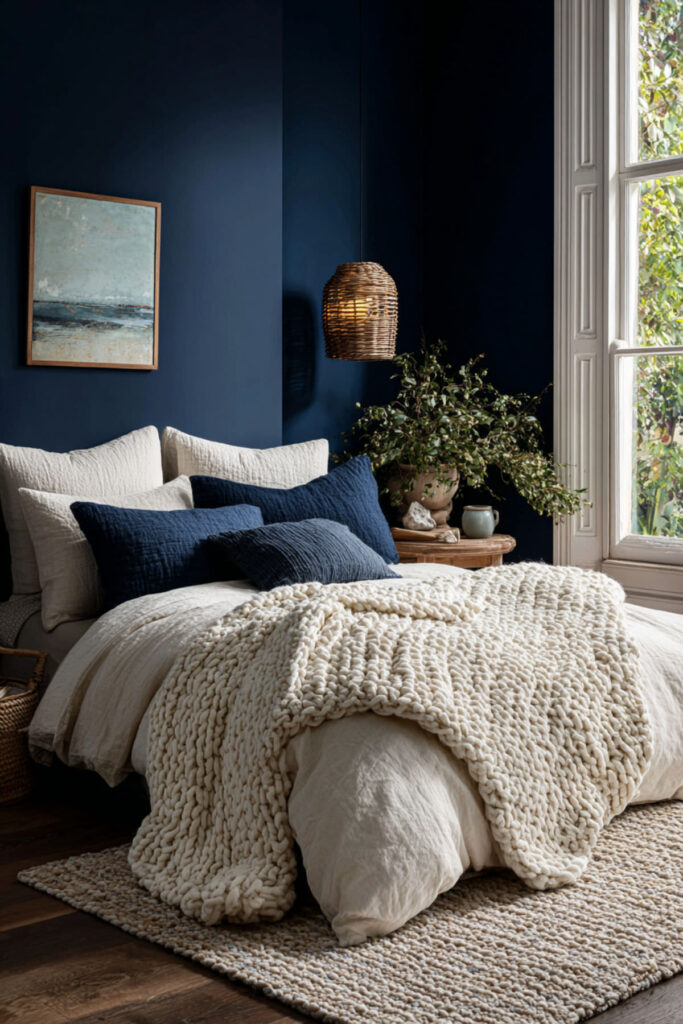 Dark blue bedroom ideas that prioritize texture over decoration create rooms that feel rich without being busy. Layered linen bedding — white bedding as the base, a dark blue throw, navy accent pillows — against dark blue walls creates a bed that looks like an invitation. I recommend stonewashed linen sheets in white with a navy linen duvet cover and a cream waffle-weave throw. Modern bedding ideas in this family are about mixing textures rather than patterns. Dark blue bedroom decor built on linen and cotton feels tactile and calming — exactly the opposite of a glowing screen. This is the kind of dark blue bedroom aesthetic that supports sleep from the moment you walk in.