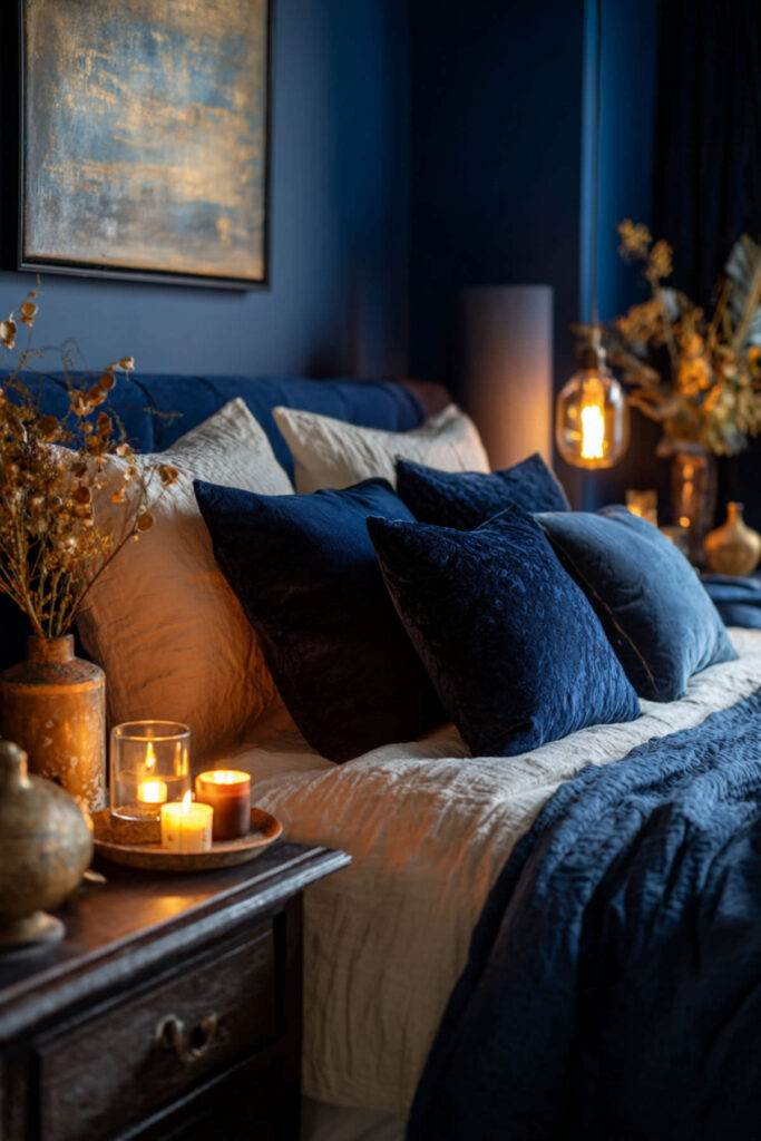 Navy Blue Bedroom Aesthetic with Velvet Textures