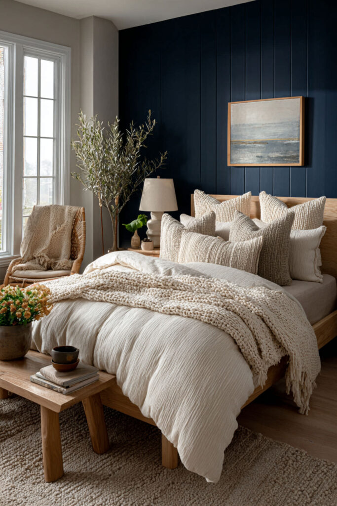 Dark Blue Bedroom Ideas with Layered Linen Bedding
