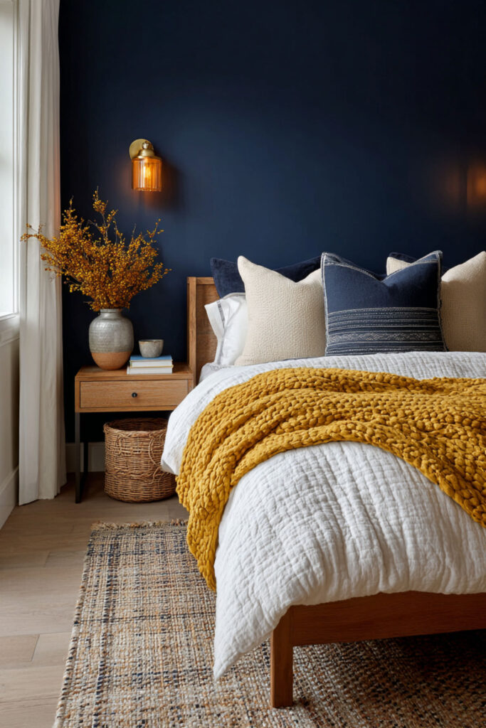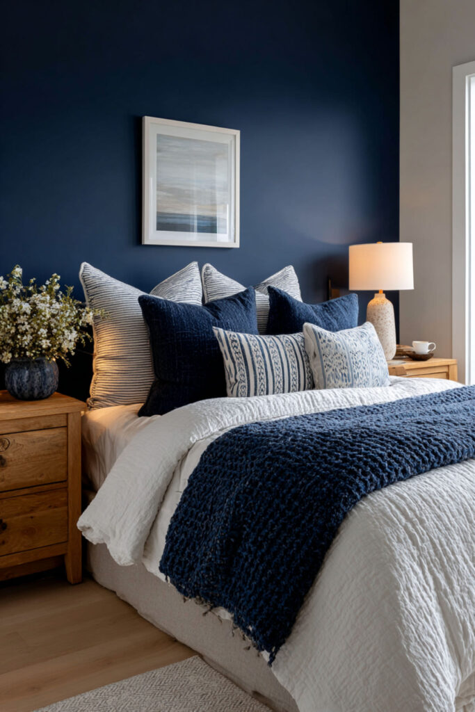 Next up — the contrast of dark blue bedroom walls and crisp white bedding is one of the most visually striking combinations in bedroom design. The dark walls recede, the white bed glows, and the whole room feels like twilight. I recommend dark blue walls bedroom in a matte finish paired with all-white bedding — white sheets, white duvet, white pillows. Then add warmth through a single throw in cream or tan and warm wood nightstands. Navy blue bedroom walls with white bedding creates this clean, hotel-like quality that’s both calming and elegant. White bedding against dark blue is also incredibly practical — easy to wash, easy to replace, always fresh-looking.