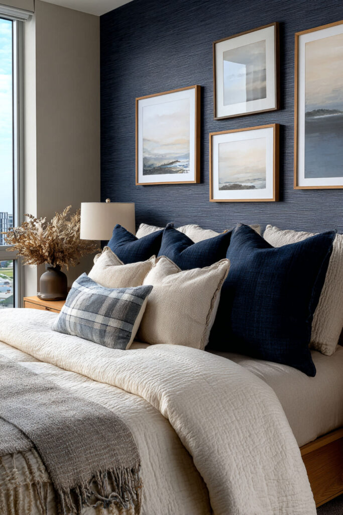 Velvet and navy blue together feel like a private club — rich, tactile, and deeply inviting. A navy blue bedroom aesthetic built around velvet textures creates a room you want to sink into. I recommend a velvet accent pillow in deep navy, a velvet throw at the foot of the bed, or even a velvet upholstered headboard. The texture catches light in a way that adds visual depth to the dark blue. A sophisticated blue bedroom with velvet elements reads as luxurious without being overdone. This navy blue bedroom decor approach works particularly well in rooms where you want maximum coziness — the velvet practically asks you to stay offline and stay in bed.