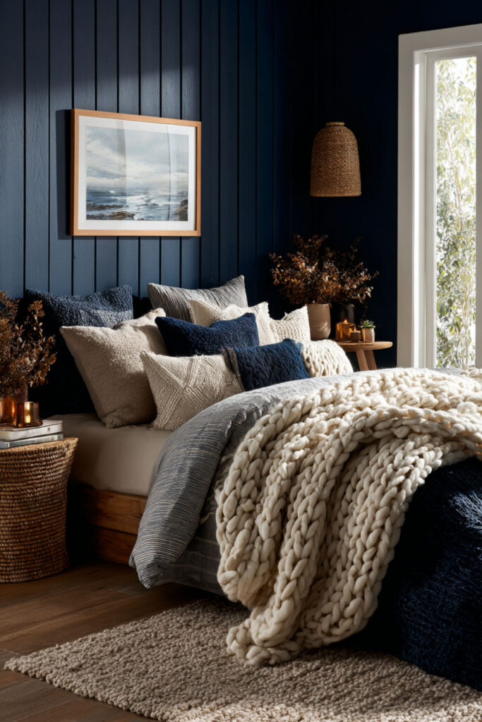 A cozy blue bedroom is built on layers — the more the better. When the goal is a room that makes you want to put the phone down and burrow in, the bed needs to feel irresistible. I recommend layering: cotton sheets, a linen duvet, a chunky knit throw, a velvet accent pillow, and at least three Euro shams. Bedrooms with navy bedding and bedroom decor ideas with navy sheets as the base create a bed that looks like a cloud floating in a midnight sky. A cozy bedroom blue bed piled with layers is the physical opposite of a screen — soft, warm, and inviting. Cozy aesthetic rooms built on midnight blue are some of the most calming spaces you can create.