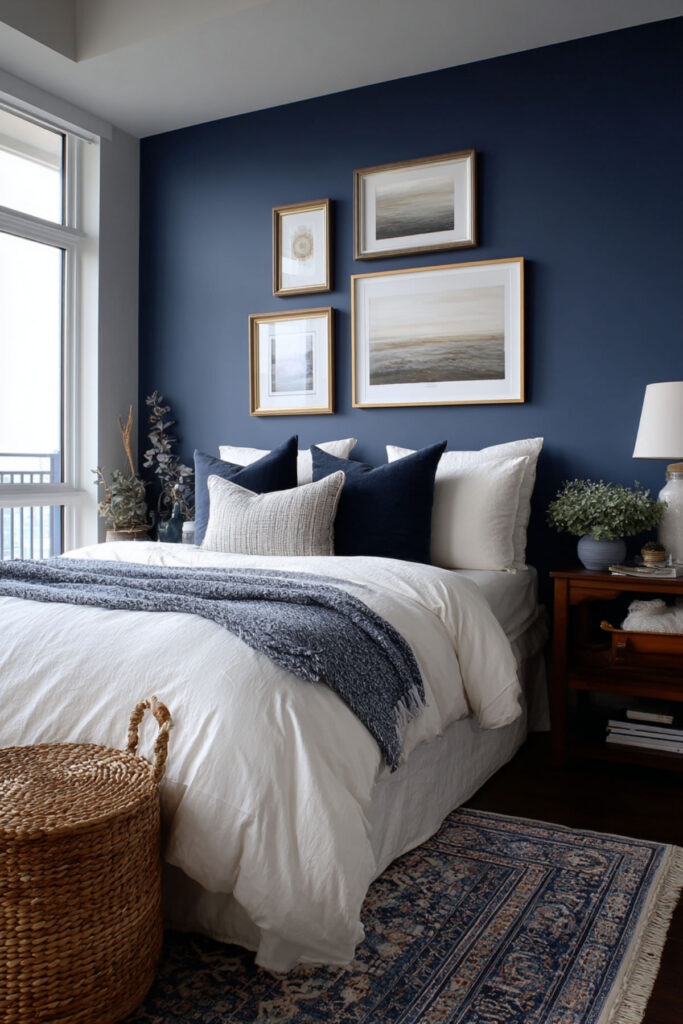 Not ready for four walls of midnight blue? A blue accent wall bedroom gives you the impact of dark blue without the full commitment. Paint the wall behind the headboard in midnight blue and keep the other three walls in warm white or soft cream. I recommend a matte finish for the accent wall — it absorbs light beautifully and creates depth. Navy blue accent wall bedroom and dark blue accent wall bedroom designs are some of the most popular starting points for women who want to test the waters with darker color. Blue accent walls in a bedroom create a focal point that anchors the room. An accent wall bedroom approach is especially smart for smaller spaces where four dark walls might feel too enclosed.