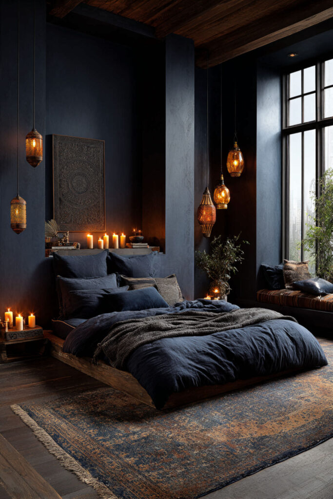 If you’re trying to break the phone-before-bed habit, lighting is everything. A moody blue bedroom with warm, low lighting naturally tells your brain it’s time to wind down. Skip the overhead fixture entirely. I recommend a pair of warm-toned table lamps with linen shades on either side of the bed, plus a candle or two on the nightstand — beeswax or soy for a cleaner burn. The moody blue color scheme in a room lit by candlelight is genuinely atmospheric. Some people think dark bedrooms feel depressing — I think they’re brilliant when the lighting is intentional. A dark blue moody bedroom with amber candlelight feels like the inside of a late-night thought — warm, quiet, and private.