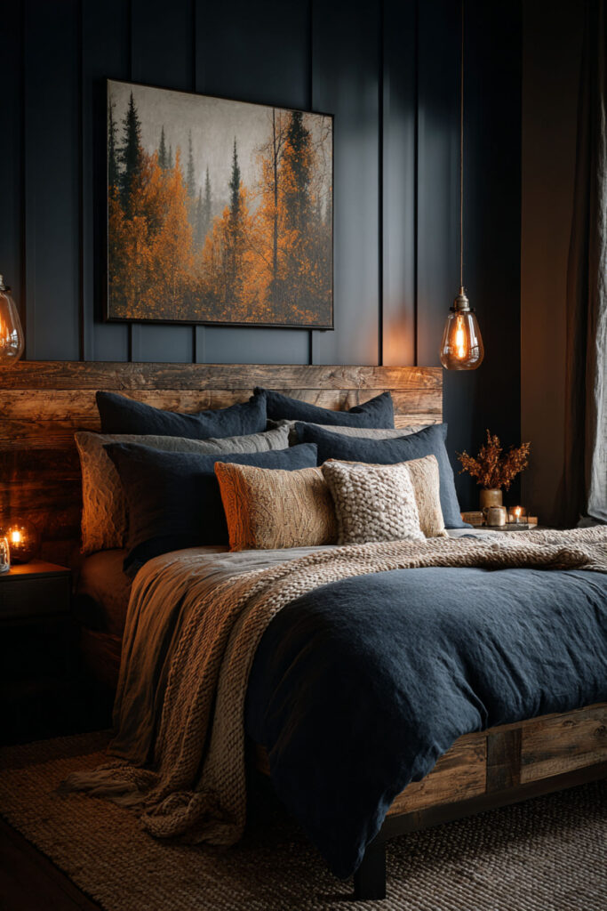 A rustic wooden bed with blue walls combines the raw warmth of natural wood with the cool depth of midnight blue for a room that feels elemental. I recommend a reclaimed wood bed frame or a solid oak platform bed paired with dark blue walls and warm cream bedding. A rustic wooden bed with blue bedding — navy linen or a dark indigo quilt — completes the look. The warm brown and brown texture of the wood against the blue creates a natural contrast that’s inherently calming. This blue bedroom design approach is perfect for women who want their bedroom to feel like a cabin retreat — far from screens, far from noise, completely present.