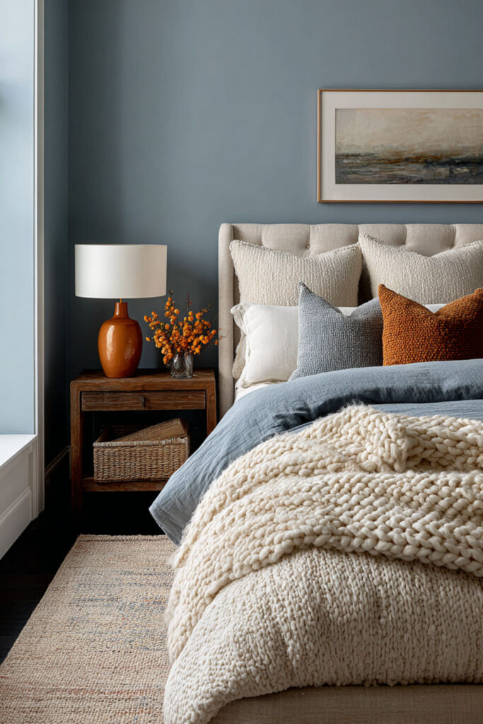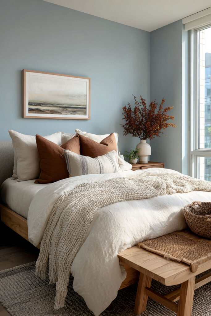 A cozy bedroom color palette ideas approach that pairs blue with cream and warm clay creates a combination that feels like earth, sky, and sand. The blue on the walls, cream in the bedding, and clay tones in accessories — a terracotta vase, warm-toned throw pillows, a rust-colored rug — make a room that’s balanced and grounding. I recommend keeping the blue muted and the clay tones warm rather than bright. Warm paint colors in the earthy range soften the blue and create a bedroom atmosphere that feels like late afternoon sunlight. This three-color palette is timeless, works in any size room, and is almost impossible to get wrong.