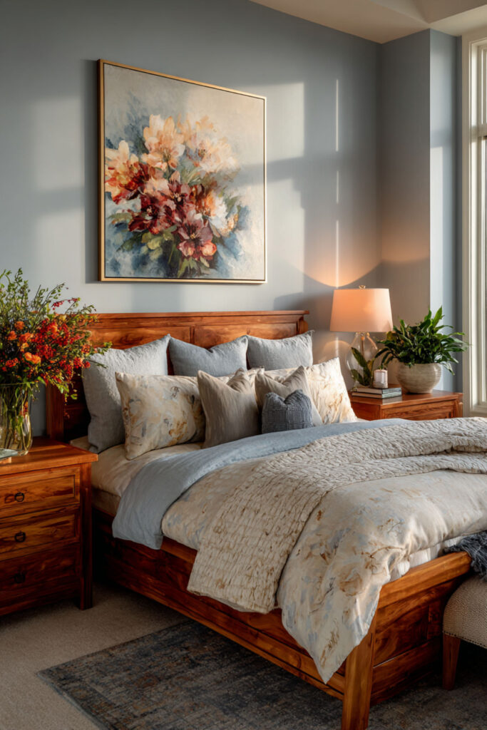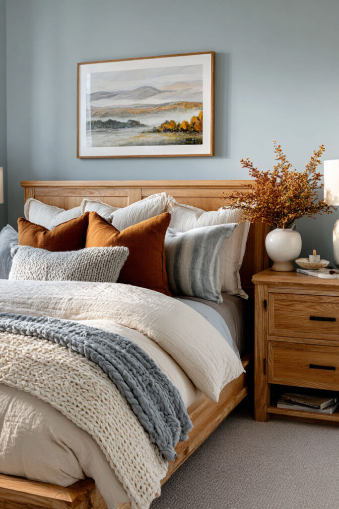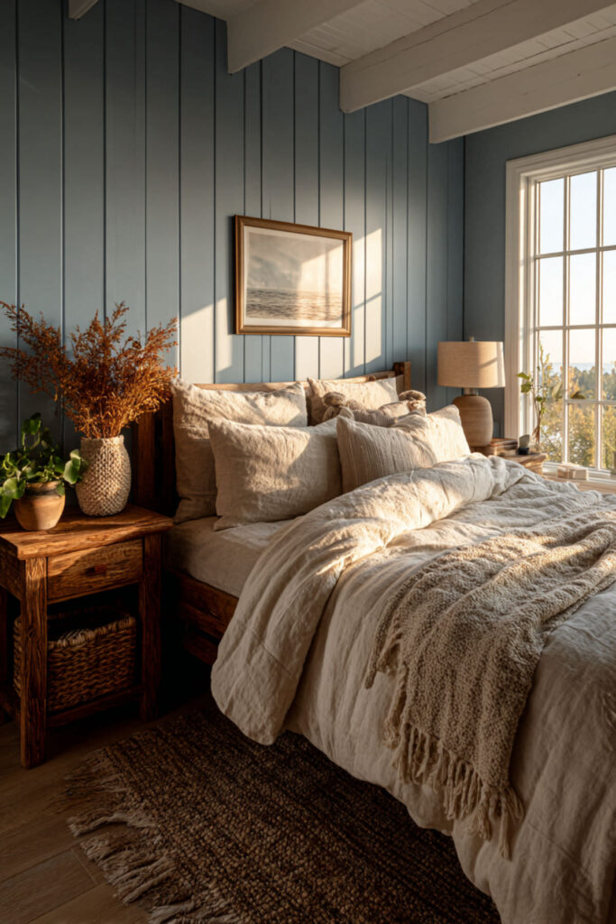 Blue and warm wood is one of those pairings that feels immediately right — like sky and tree. Cozy earthy bedroom ideas in this combination use a reclaimed wood bed frame, warm walnut nightstands, or a live-edge headboard against soft blue walls to create a room that feels pulled from nature. I recommend pairing the blue with medium-toned wood rather than dark — walnut, aged oak, or reclaimed barn wood all work beautifully. Natural wood furniture grounds the blue and keeps it from feeling too cool. An earthy bedroom in this palette feels stable and restorative, exactly the kind of room a nature-loving woman wants to return to.