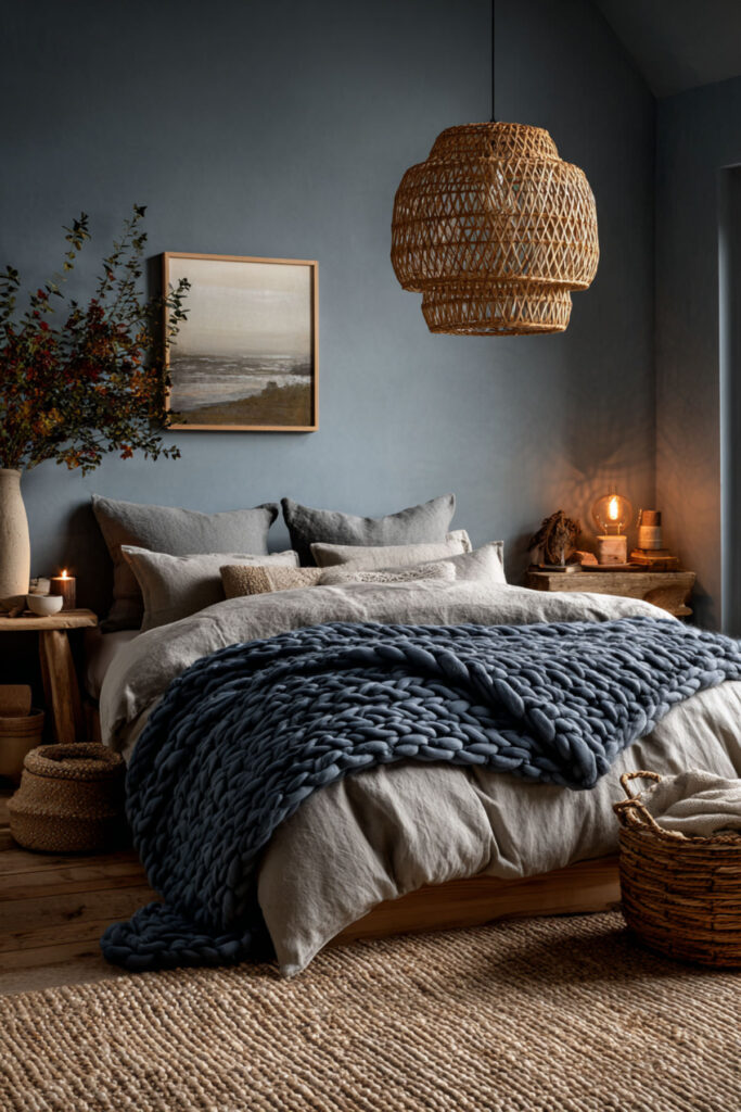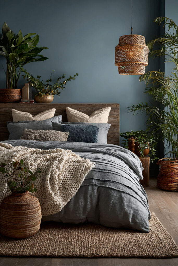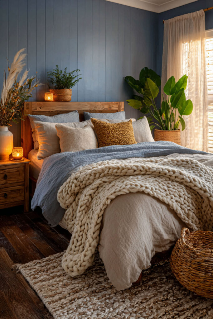 Cozy Boho Bedroom Ideas with Blue and Earthy Layers