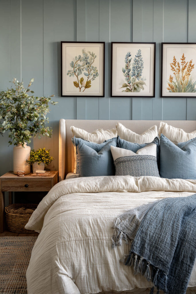 A nature-inspired gallery wall gives your blue bedroom depth and personal meaning. Cozy bedroom aesthetic ideas that include framed botanical prints, pressed fern art, landscape watercolors, or vintage nature illustrations create a wall that tells a story. I recommend simple wood frames in warm oak or walnut, hung above the bed or beside a reading nook. The art doesn’t need to match — collected over time is better than bought as a set. Bedroom aesthetic ideas inspiration built on nature photography and botanical art connects the room to the outdoor world. This is the kind of bedroom décor that feels lived-in and intentional, like a woman who knows exactly who she is.