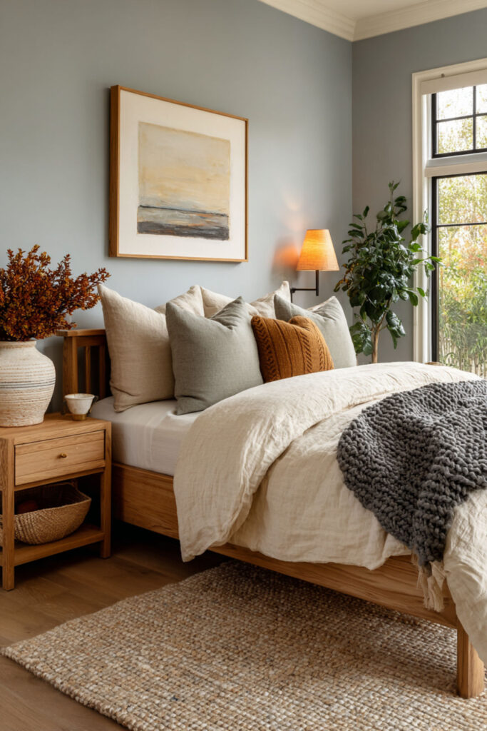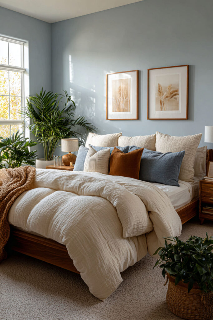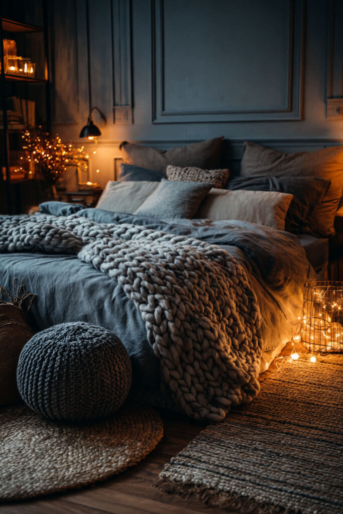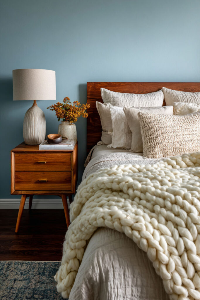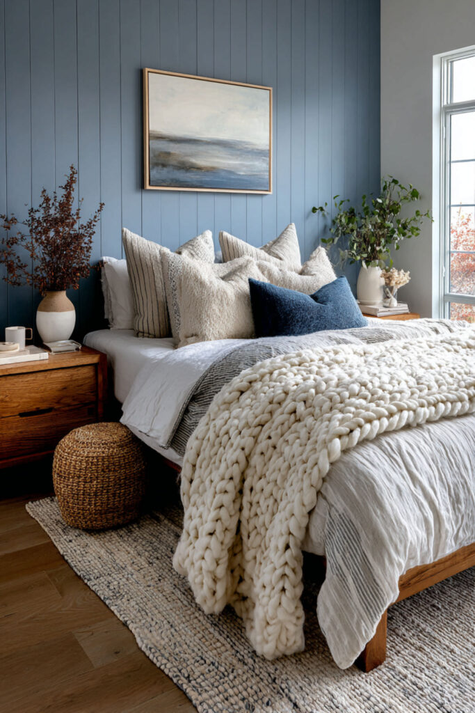Warm cozy bedroom ideas are built on layered bedding — and in a blue earthy bedroom, the layers are everything. I recommend starting with organic cotton sheets, adding a linen duvet in cream or warm grey, layering a chunky knit or waffle-weave throw at the foot, and finishing with layered bedding ideas cozy bedroom style accent pillows in earthy tones. Bedroom bedding ideas cozy and bedspread ideas cozy bedroom approaches prioritize texture over pattern. A styled bed in blue and earth feels like a nest you’ve built specifically for yourself. Warm and cozy bedroom ideas in this palette prove that the bed is the most important piece of furniture in the room — make it feel like a reward.