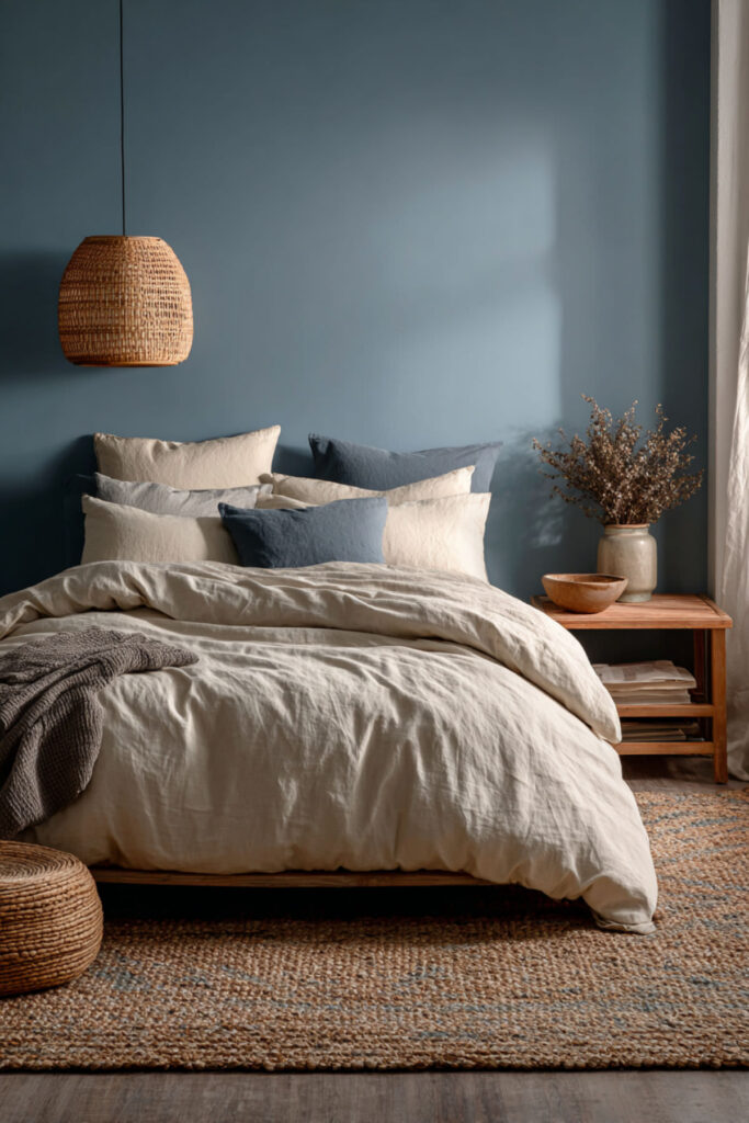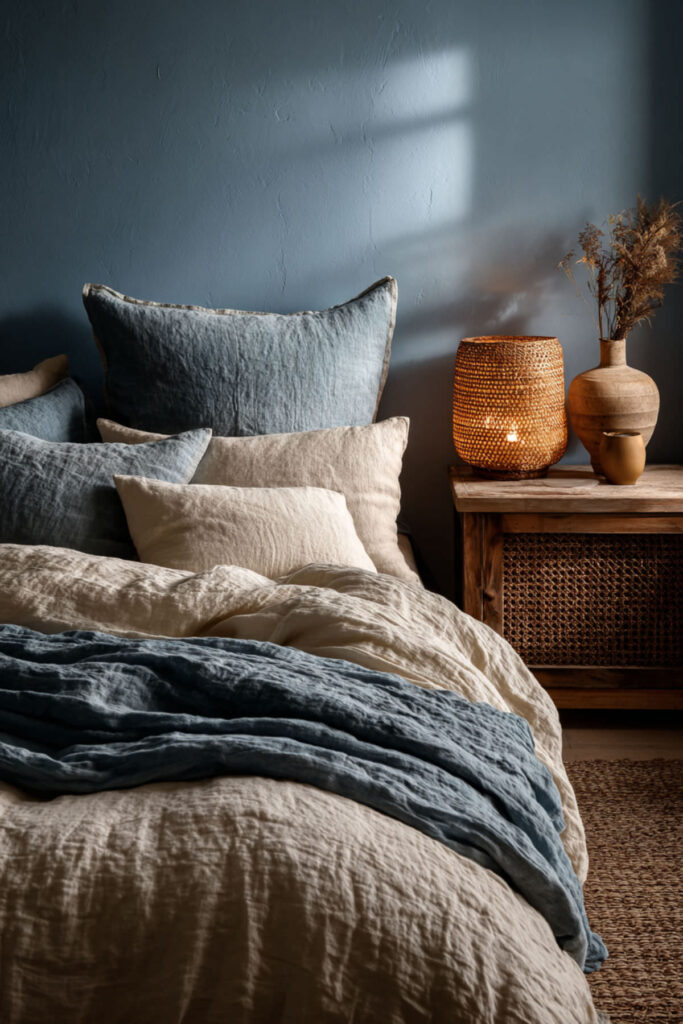 Texture is where a cozy blue earthy bedroom really comes alive. Cozy bedroom decor ideas in this palette lean into organic materials — linen with a visible weave, nubby cotton throws, wool blankets with a soft hand, jute rugs that feel warm underfoot. I recommend layering at least three different textures in the bedding alone: cotton sheets, a linen duvet, and a chunky knit or waffle-weave throw. Subtle texture is what separates a room that looks good from a room that feels good. Block printed pillows in indigo and cream add pattern without visual noise. Hotel sheets in organic cotton underneath complete the tactile experience. Bedroom decor cozy setups built on texture feel expensive without being complicated.