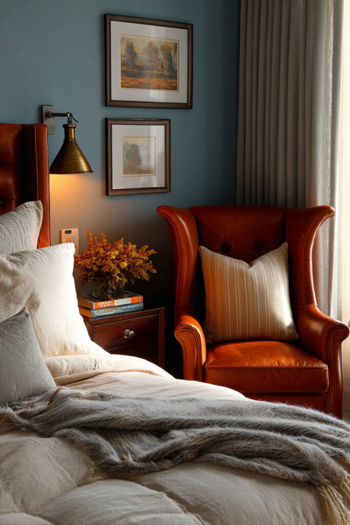 A reading nook in a blue earthy bedroom is where nature-loving women recharge. Cozy bedroom ideas for women who read — or journal, or sit with a cup of tea — need a corner that’s separate from the bed. I recommend a comfortable linen armchair in cream or warm grey, a brass floor lamp, a small wood side table, and a throw blanket within reach. Book corner ideas bedroom cozy nook reading areas turn a corner into a destination. A cozy bedroom corner ideas setup against a blue wall feels like the coziest seat in the house. Bedroom makeover ideas for women cozy enough to actually linger in always include a reading spot. The nook becomes your room within the room.