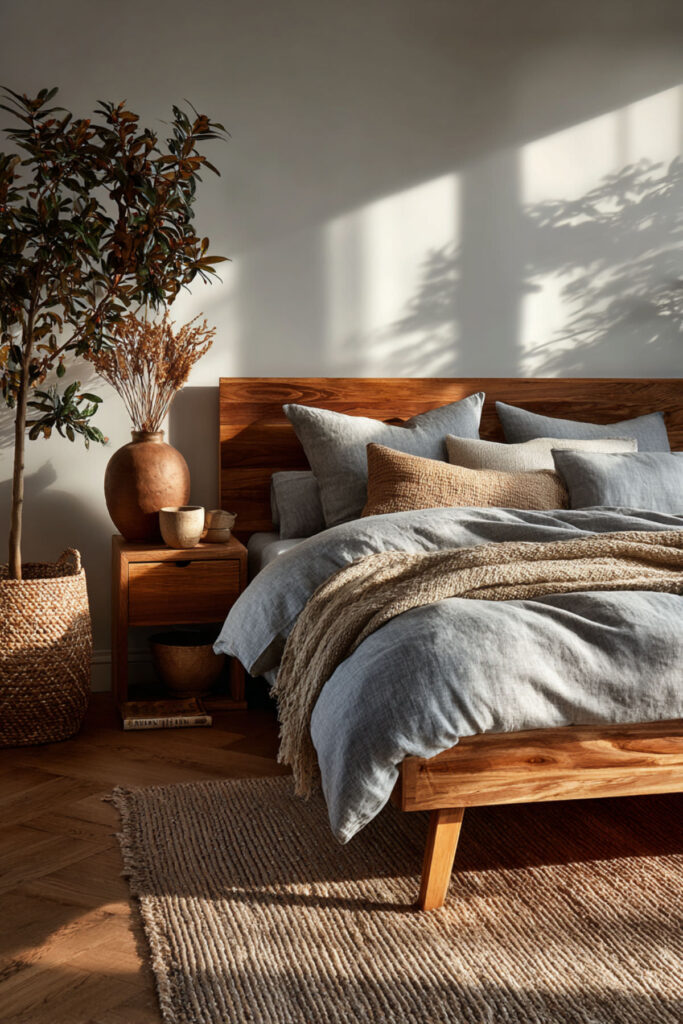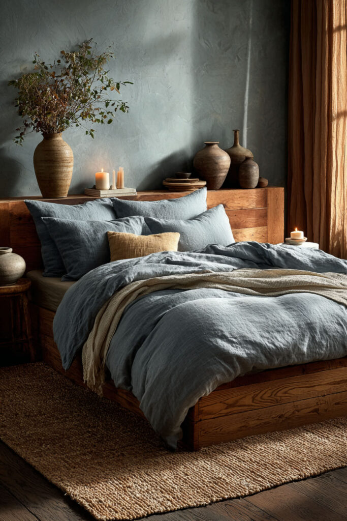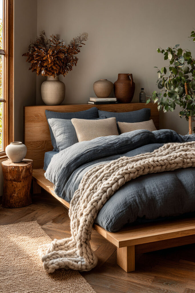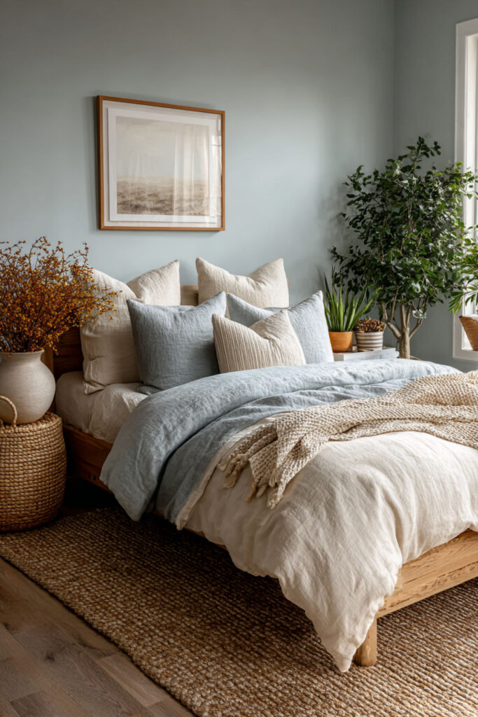Japandi Bedroom with Earthy Blues and Natural Textures